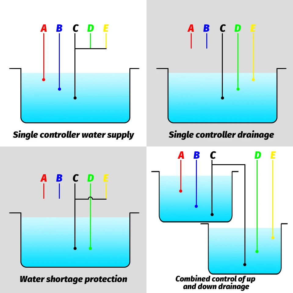 Contrôle du niveau de bassin de limite électronique pour le point suivant, l'eau atteint le point E augmente le niveau d'eau, l'eau en contact avec la sonde, le contrôleur de niveau d'eau ouvre automatiquement la pompe, drainage de l'étang ; Sans drainage, le point E n'est pas connecté ;