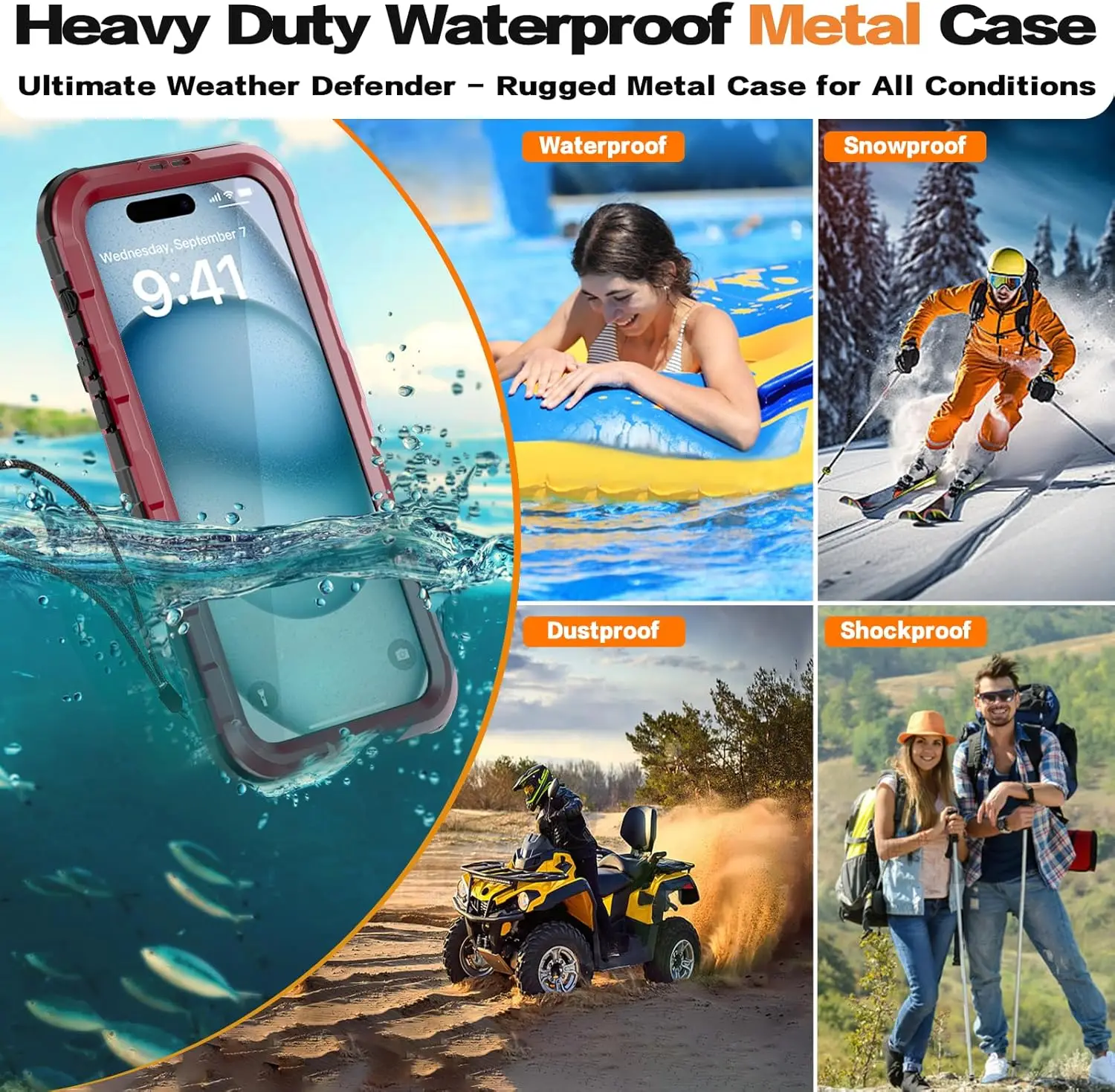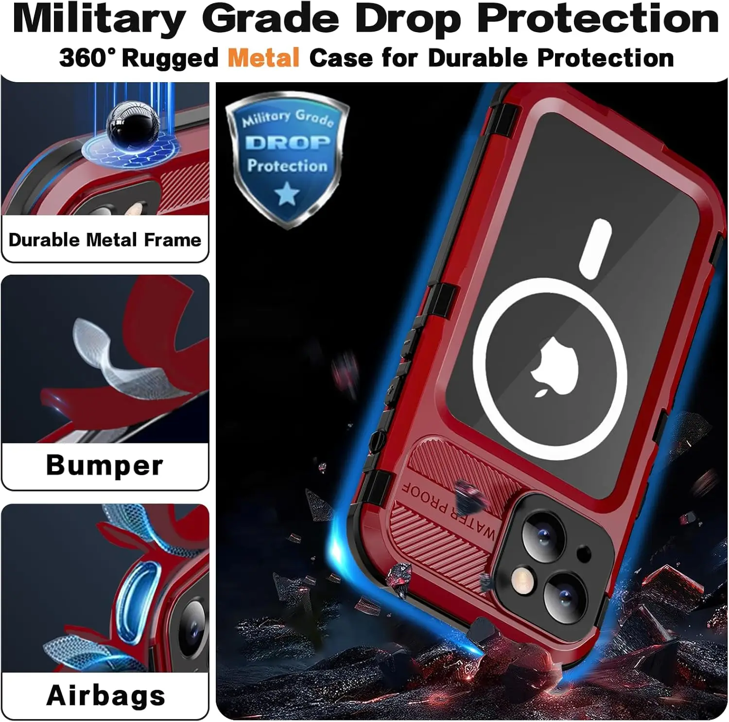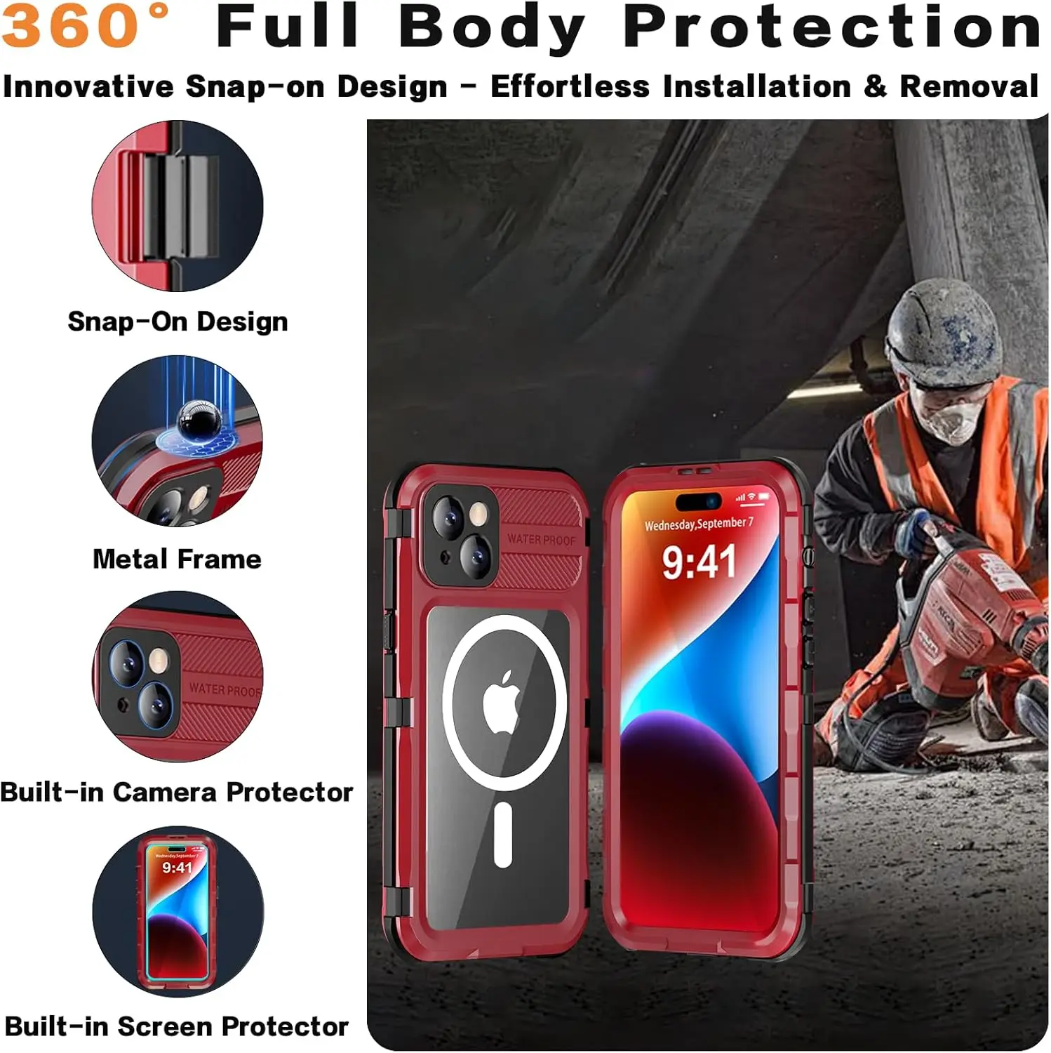 - tanche : certifié IP68 étanche, conçu et testé pour soulever plus de 6,6 pieds de profondeur pendant 1 heure.La coque intégrale empêche toute saleté et poussière de pénétrer dans la coque de votre iPhone.Protégez votre téléphone de l'eau, de la pluie.
