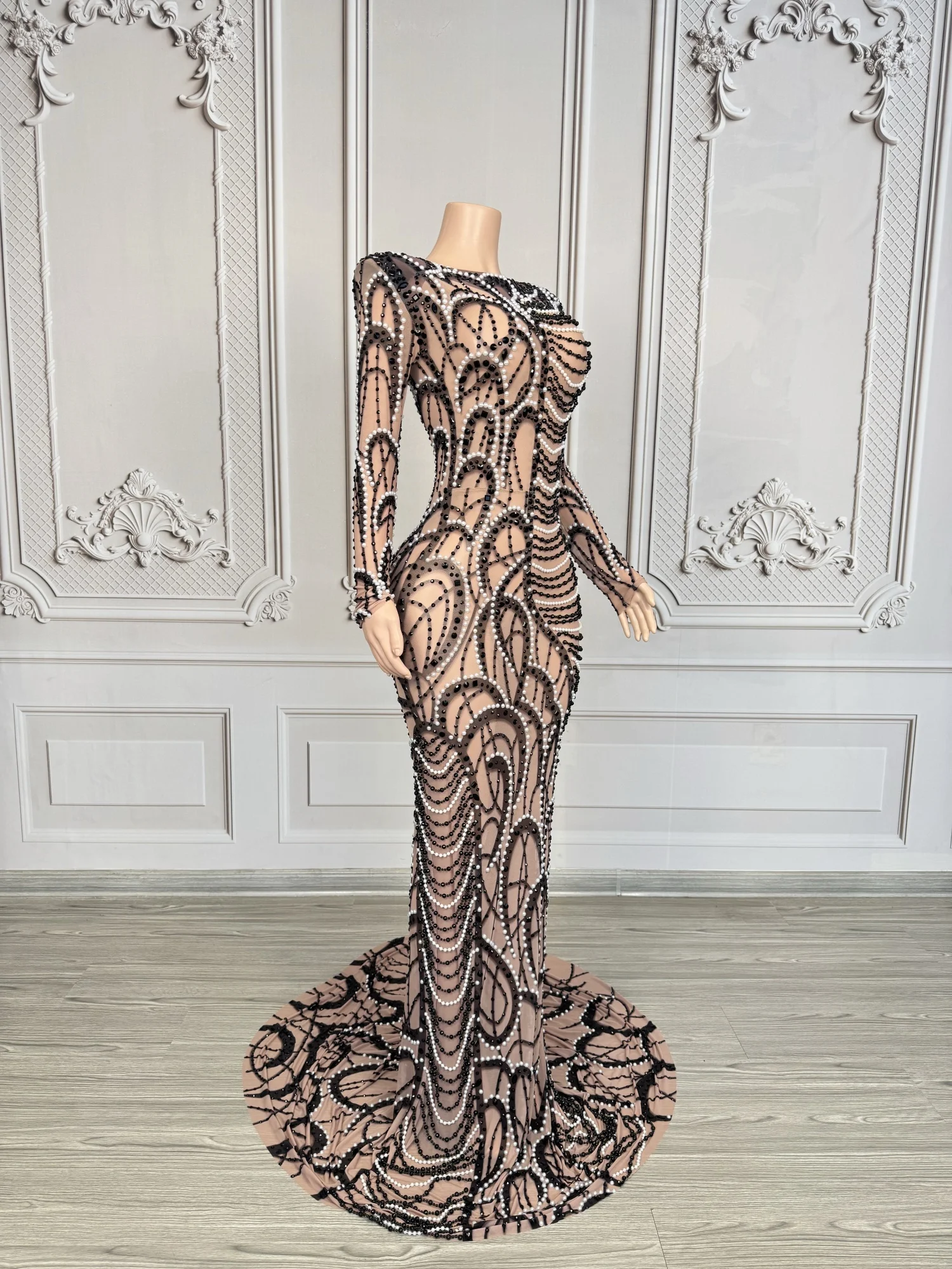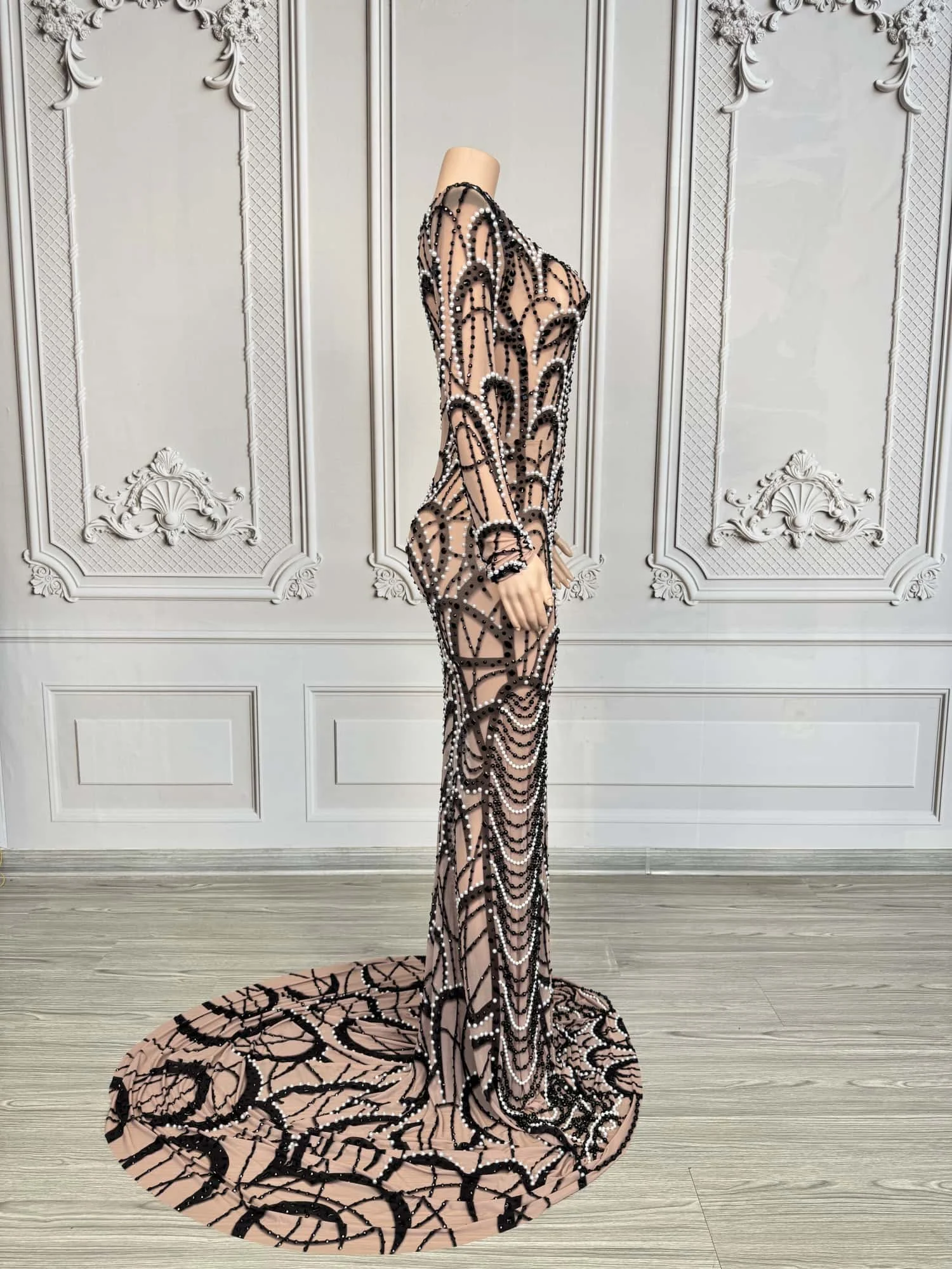 Design Sense robe de soirée pour femmes noir blanc Double couleur perle Sexy maille Perspective célébrité tapis rouge robe yueshi