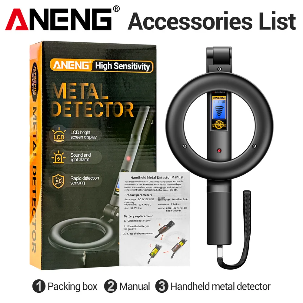 Le forfait comprend : détecteur de métaux DM3005B 1, instructions 1, bote d'emballage 1