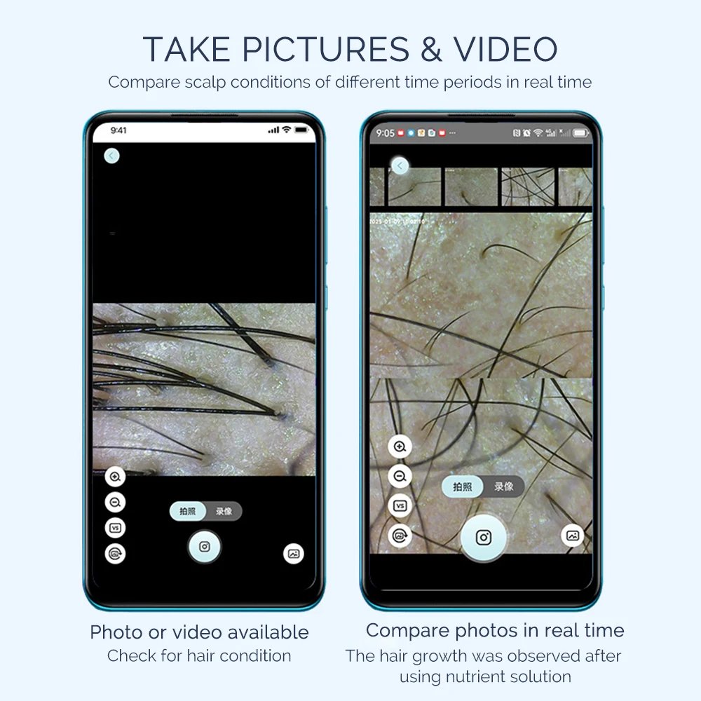 4. Problèmes du cuir chevelu, vérifiez à tout moment.cran haute définition, prend en charge la fonction de photo et d'enregistrement d'écran, peut enregistrer les résultats des tests en temps réel, pratique pour comparer les changements de santé du cuir chevelu.