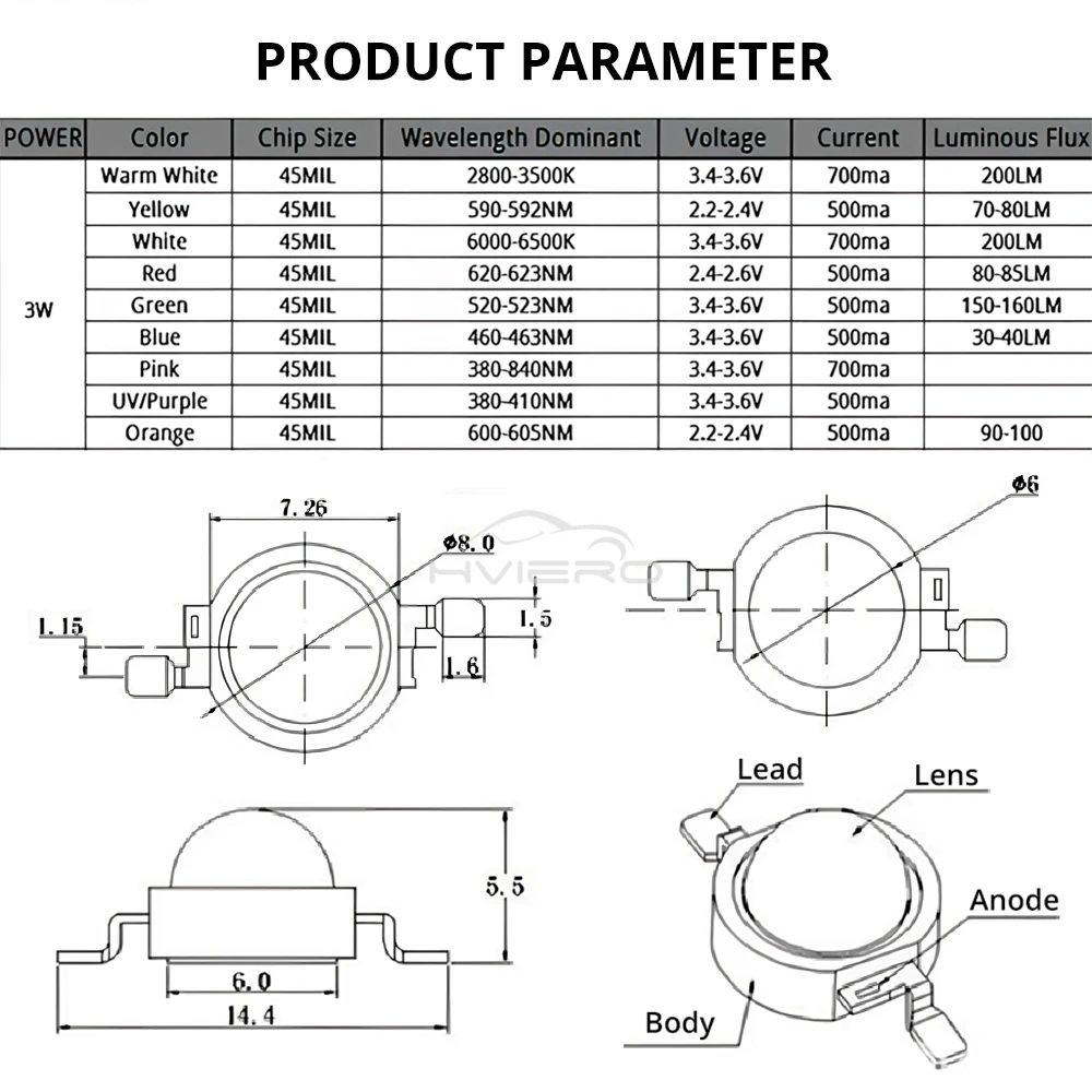 Blanc chaud (3000-3500K) : tension 3,4-3,6 V, courant 700 mA, flux lumineux 200 LM.