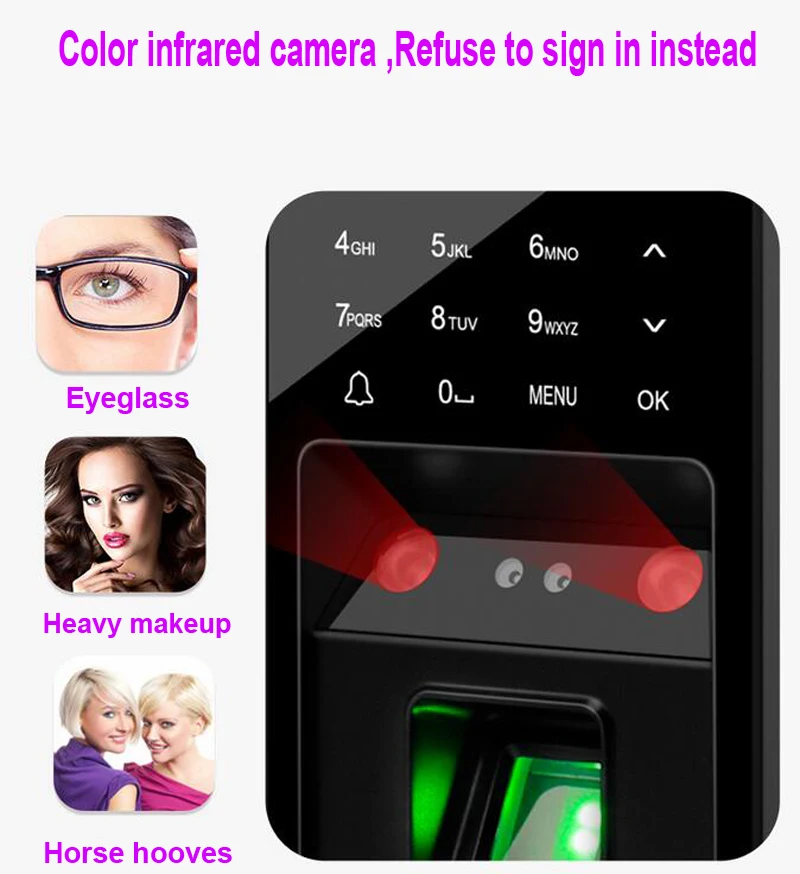 capacity:300 faces, 3000 fingerprints, 3000 cards,3000 passwords, 100,000 records