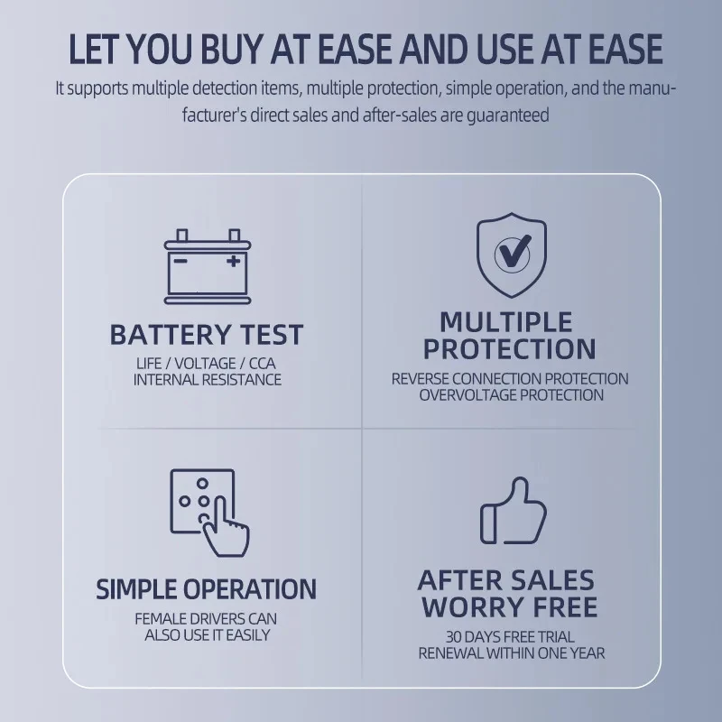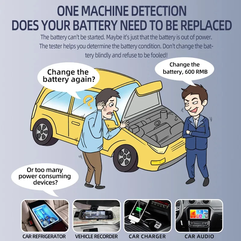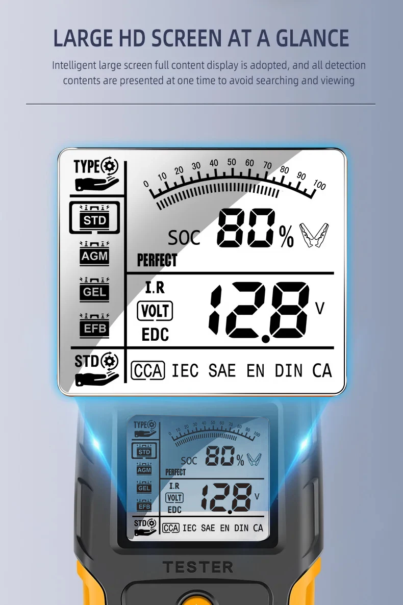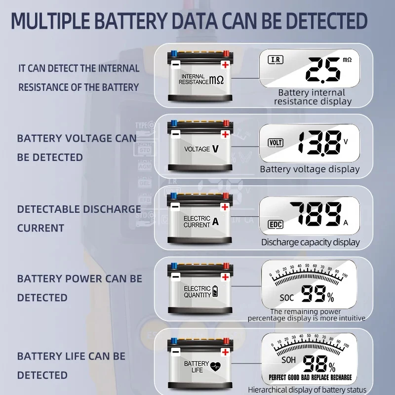 Champ d'utilisation : toutes les batteries de démarrage au plomb de voiture, y compris les batteries de tablette normales inondées, EFB, AGM, les batteries à enroulement AGM, les batteries GEL, WET, etc.