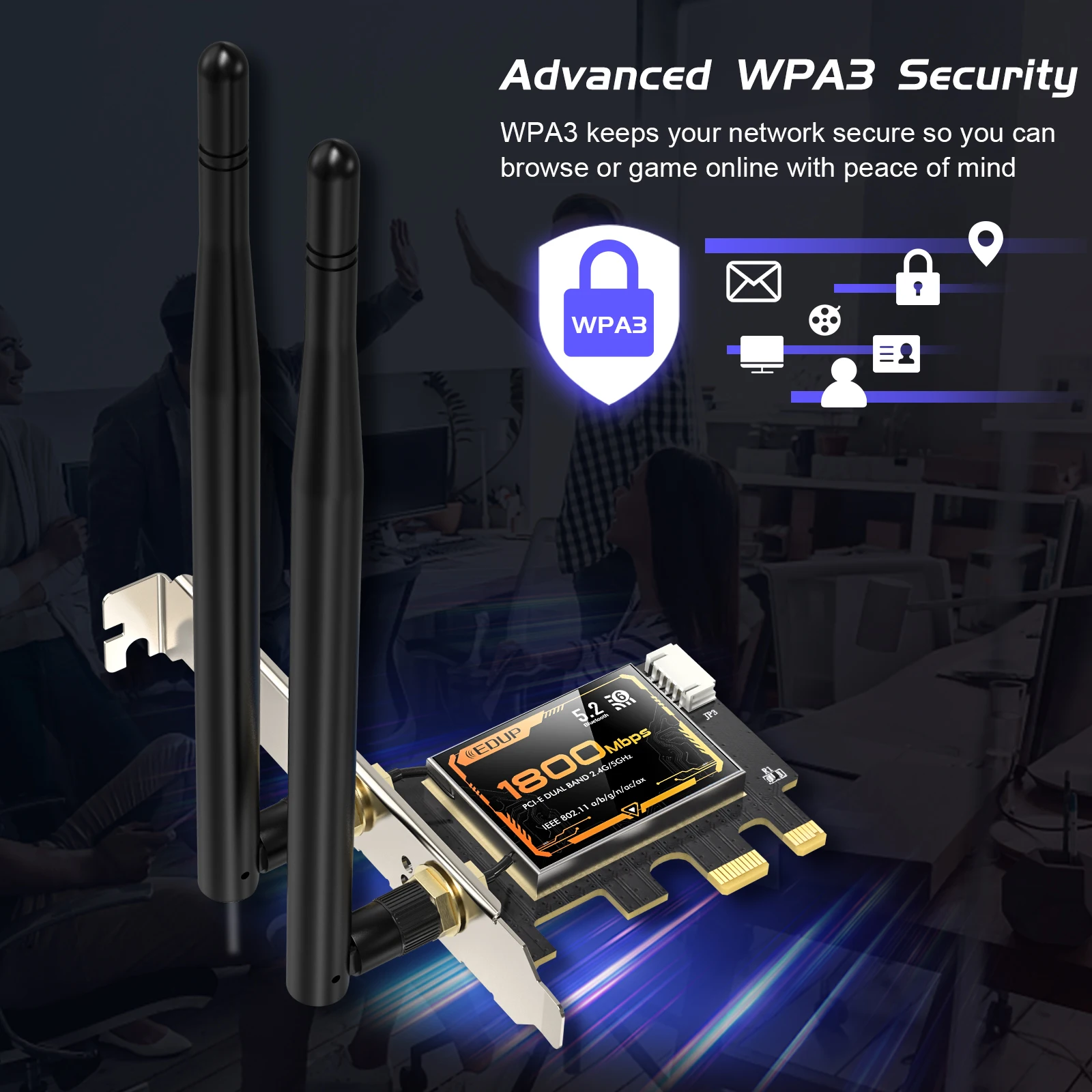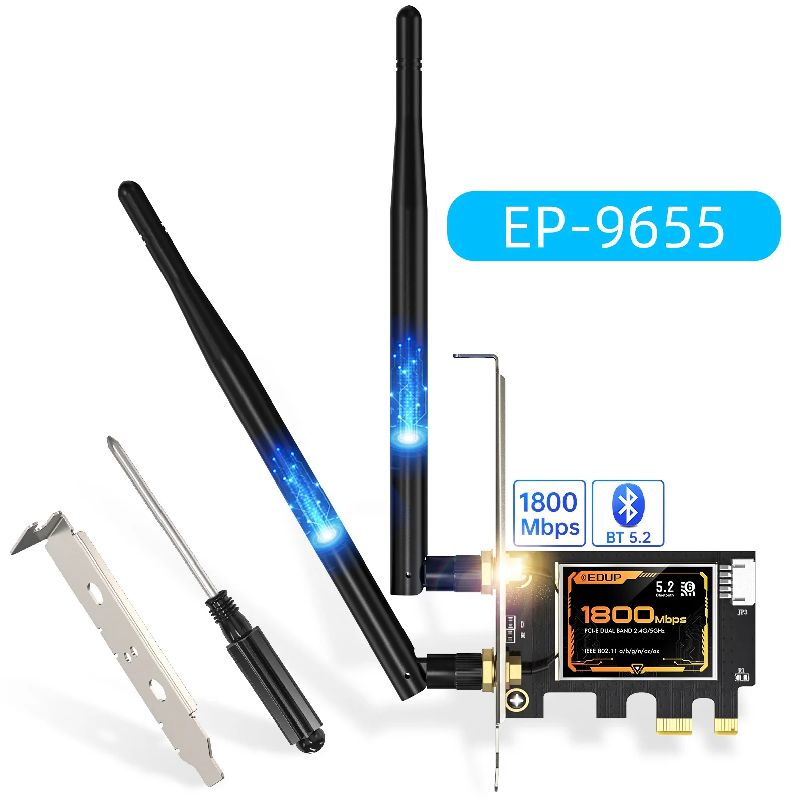 EDUP 9655 AX1800 WIFI avec carte réseau Bluetooth 5.2 PCI-E adaptateur sans fil antenne 2*6 dBi système d'exploitation Windows 10 Linux
