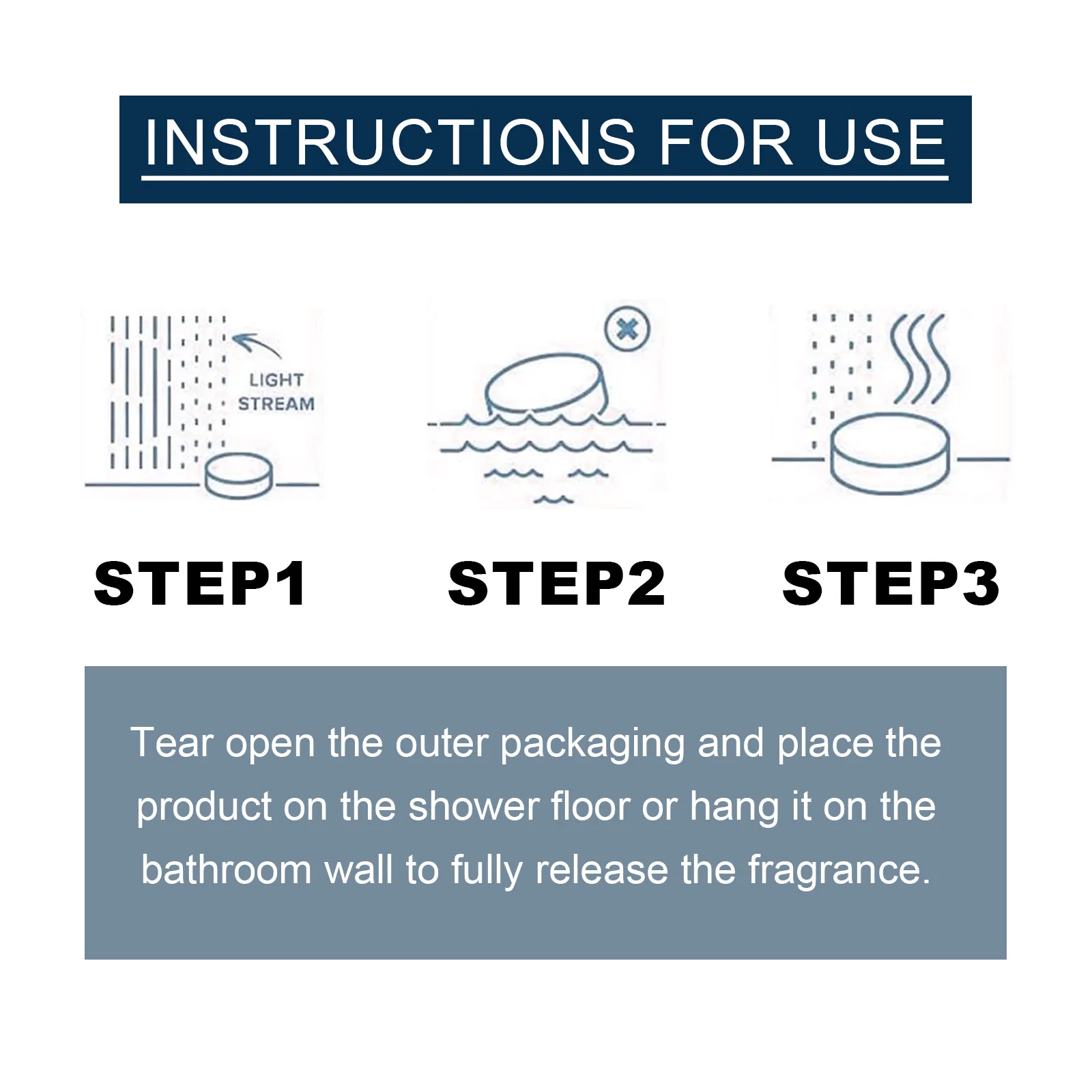 Déchirez l'emballage extérieur et placez le produit sur le sol de la douche ou accrochez-le au mur de la salle de bain pour libérer pleinement le parfum.