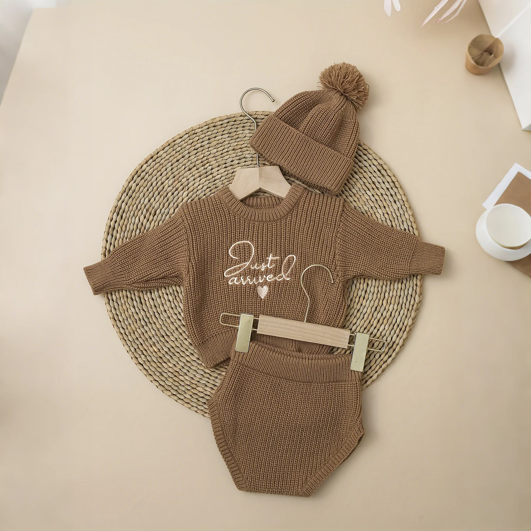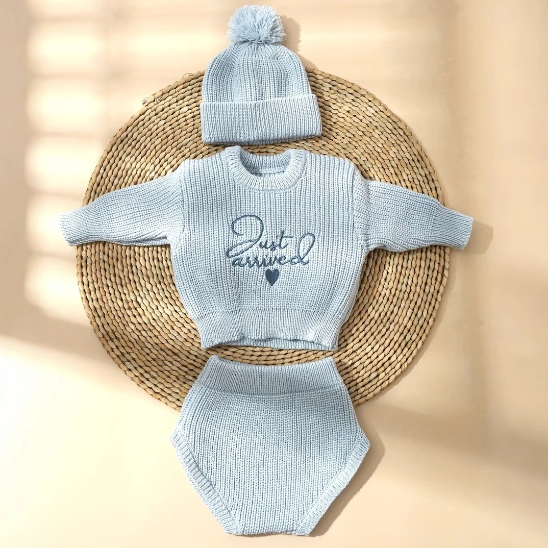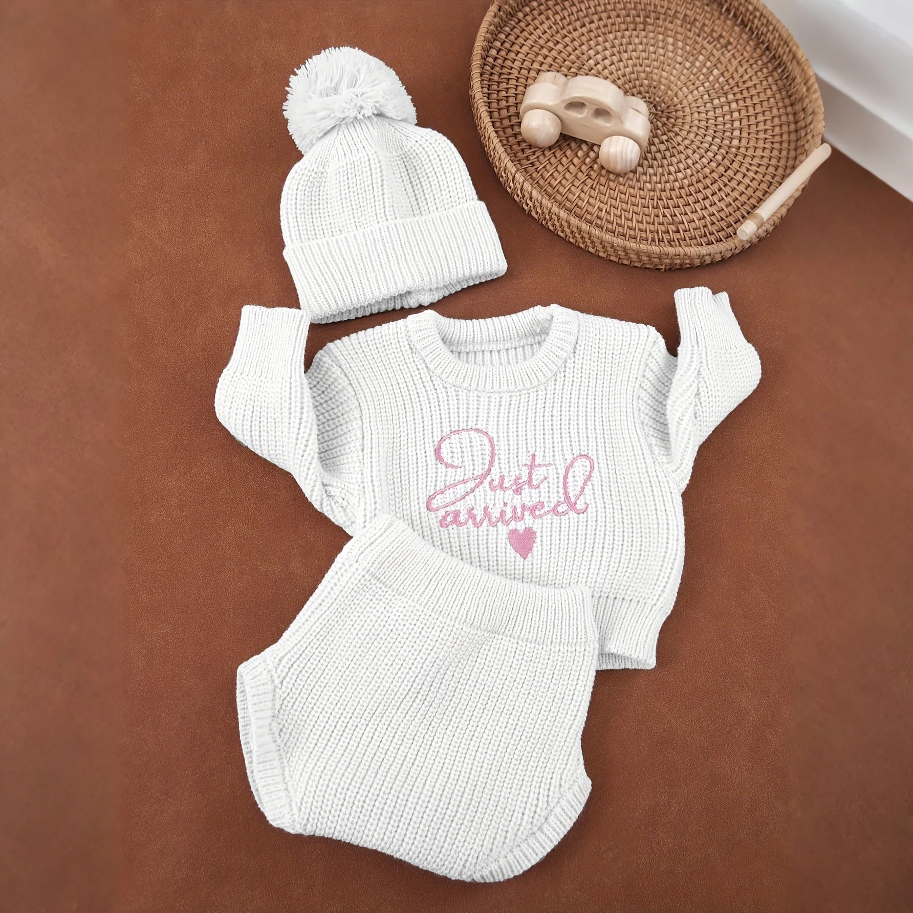 Ensemble de 3 pièces en tricot pour nouveau-né garçon et fille, tenues de photographie avec bonnet à pompon assorti, couvre-couche pour bébé, broderie Hello World, tricot