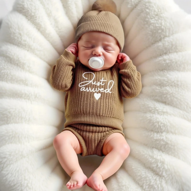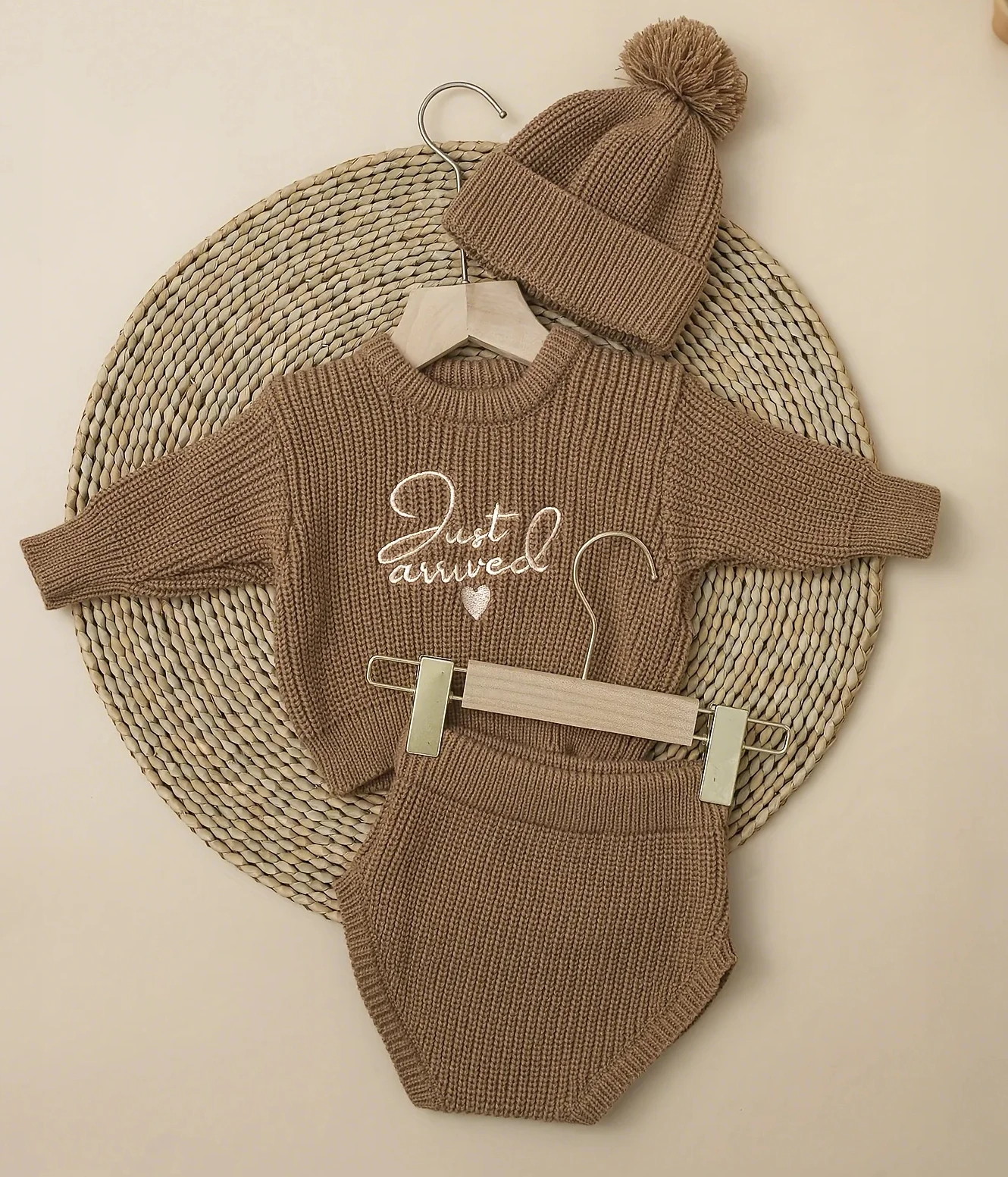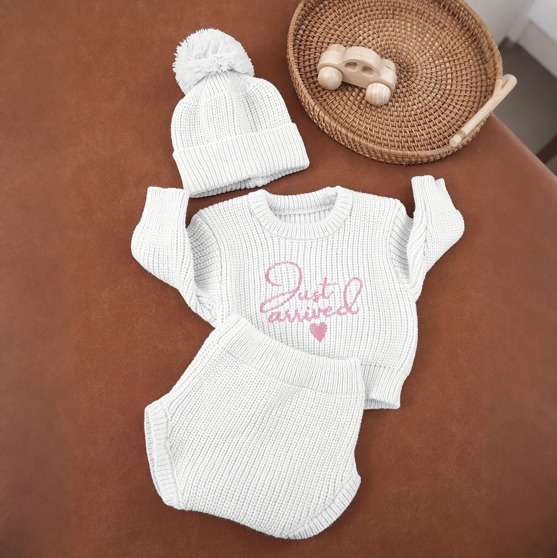 Ensemble de 3 pièces en tricot pour nouveau-né garçon et fille, tenues de photographie avec bonnet à pompon assorti, couvre-couche pour bébé, broderie Hello World, tricot