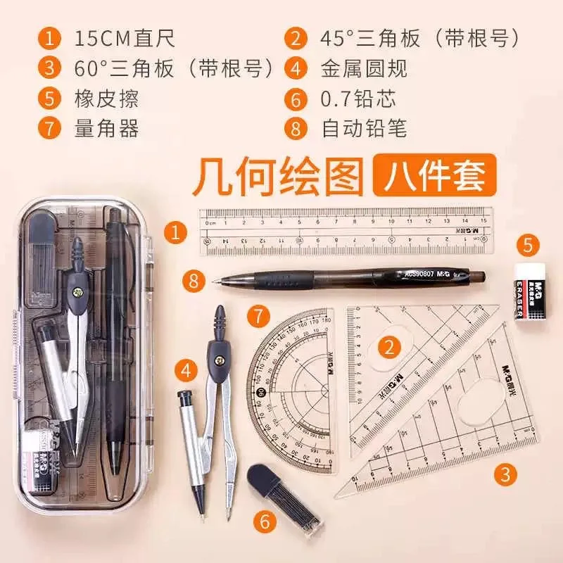 Cet ensemble de compas comprend un compas, une règle, un triangle, un rapporteur, une gomme et un crayon à mine, offrant tout ce dont un étudiant a besoin pour ses études.