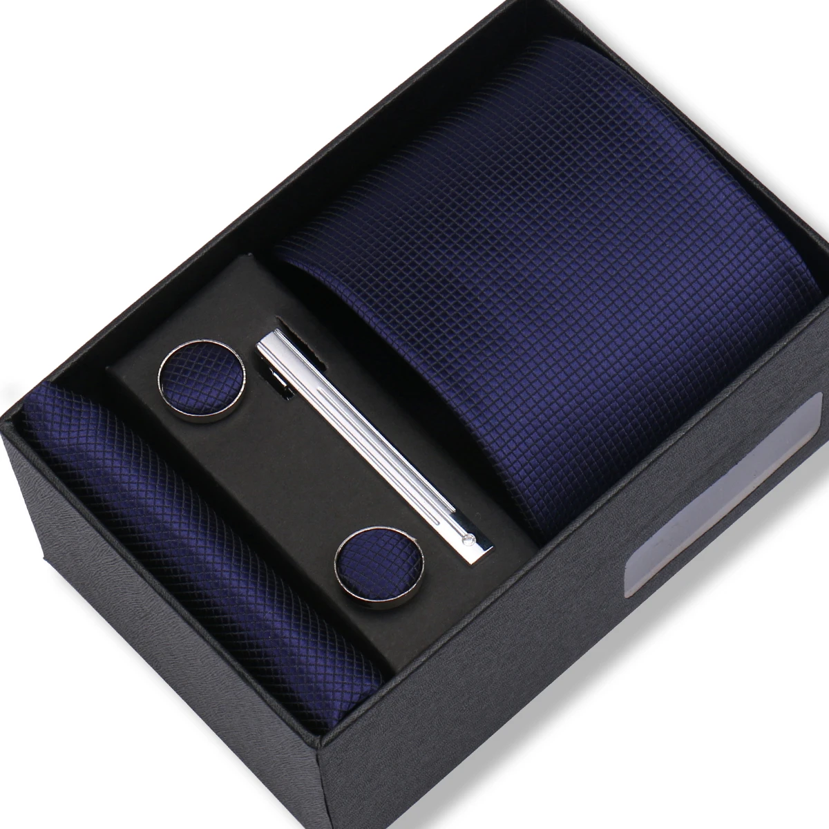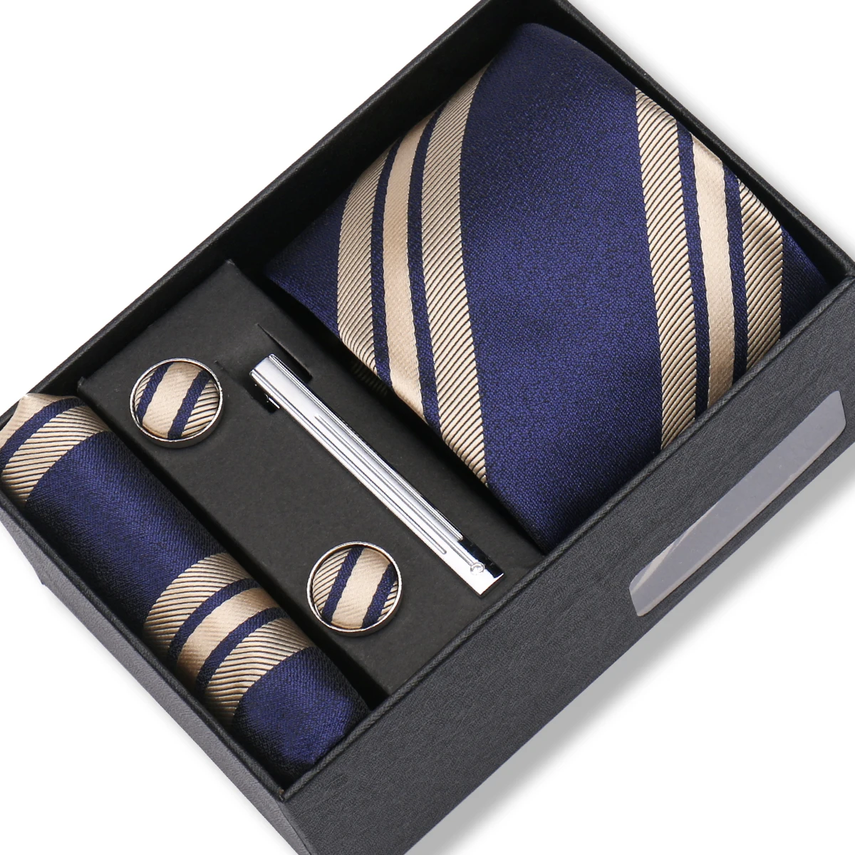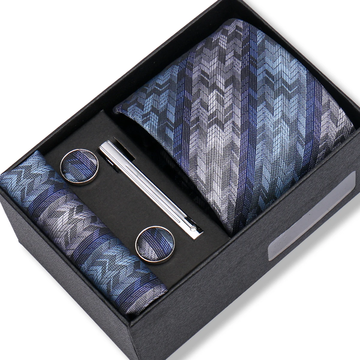 (inclure 1 cravate, 2 boutons de manchette, 1 squre de poche, 1 coffret cadeau et 1 pince à cravate)
