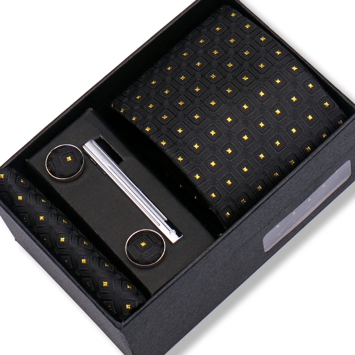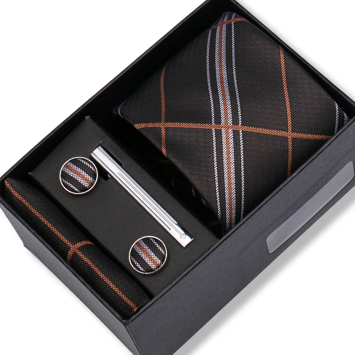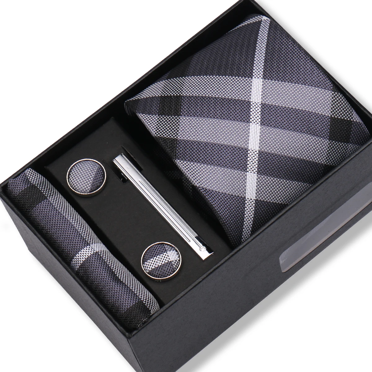 (inclure 1 cravate, 2 boutons de manchette, 1 squre de poche, 1 coffret cadeau et 1 pince à cravate)