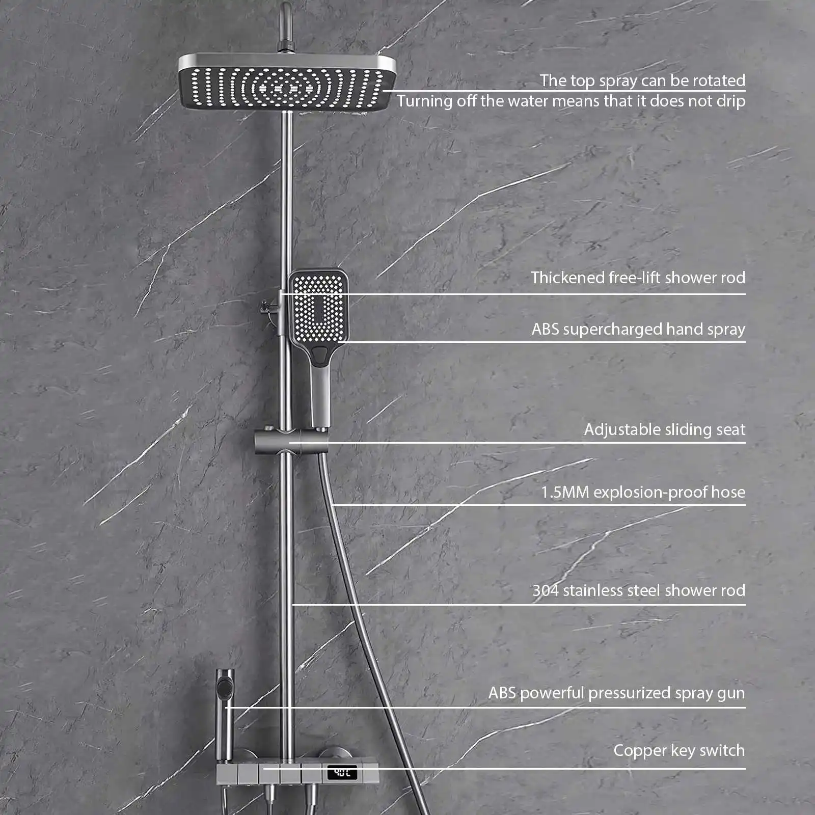 Ensemble de douche de salle de bain avec affichage numérique, mitigeur en cuivre et pommeau de douche à pression accrue