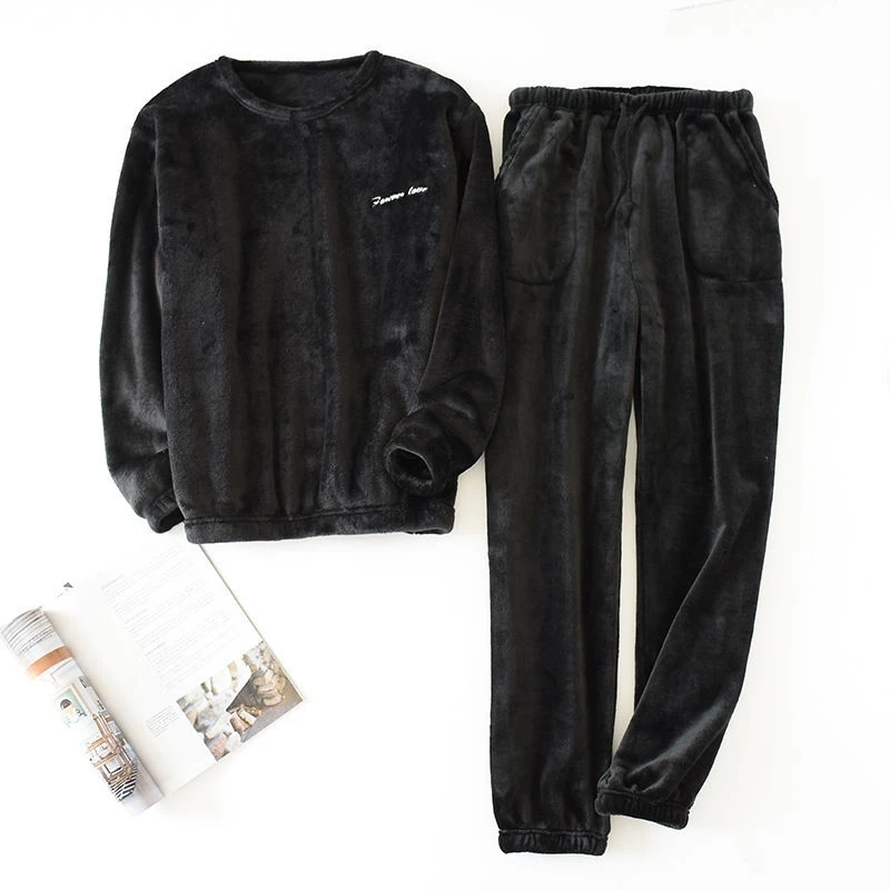 Ensemble pyjama 2 pièces pour hommes, Style Simple, décontracté, chaud, flanelle, vêtements de détente, couleur unie, manches longues, col rond, haut, pantalon ample, costume d'hiver pour la maison