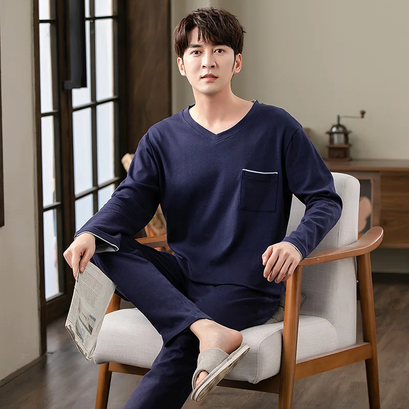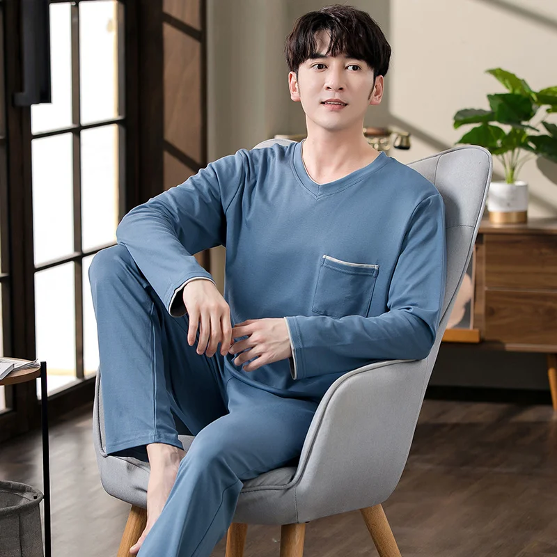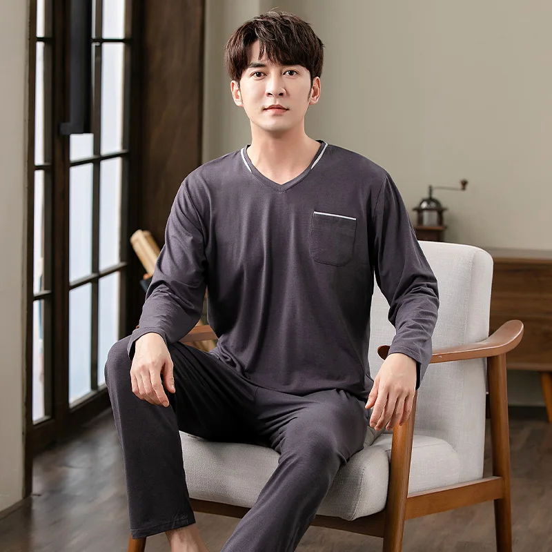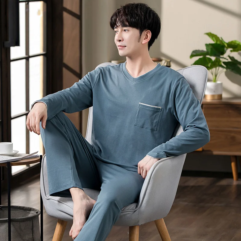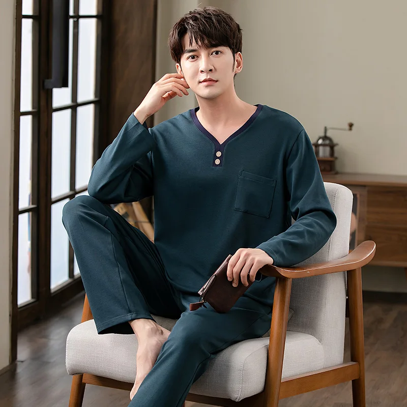 Ensemble pyjama en coton à col en v pour hommes, hauts à manches longues + pantalons longs, vêtements de nuit pour la maison, vêtements de nuit simples à la mode pour hommes, automne