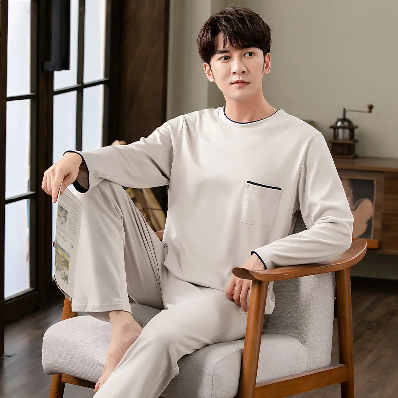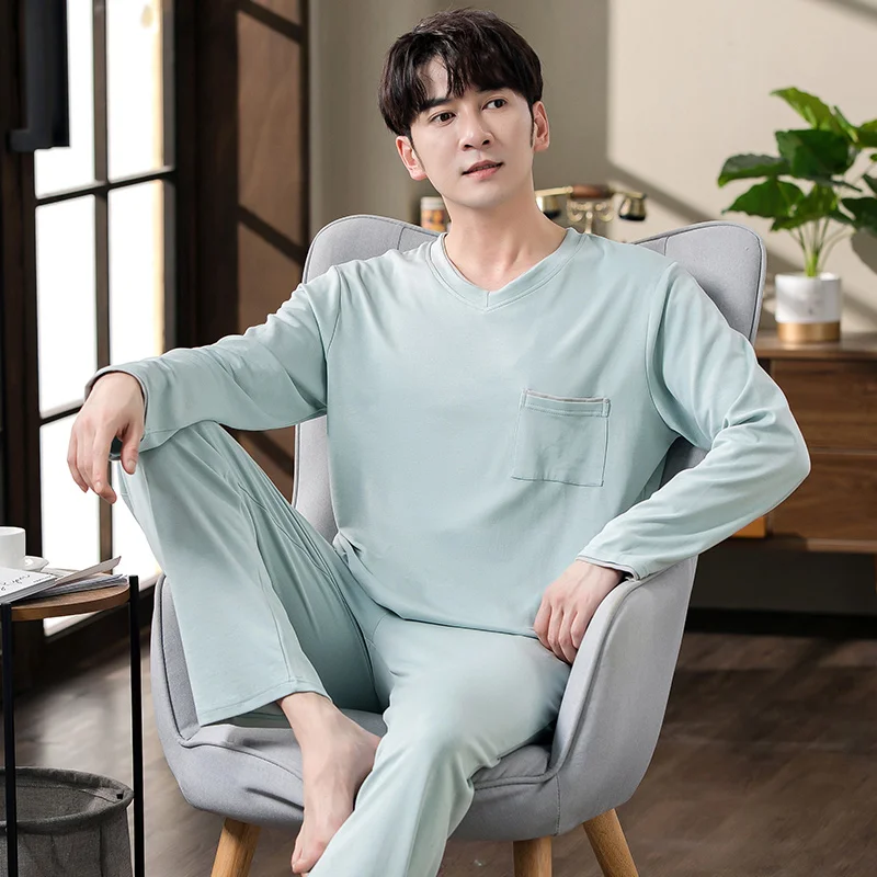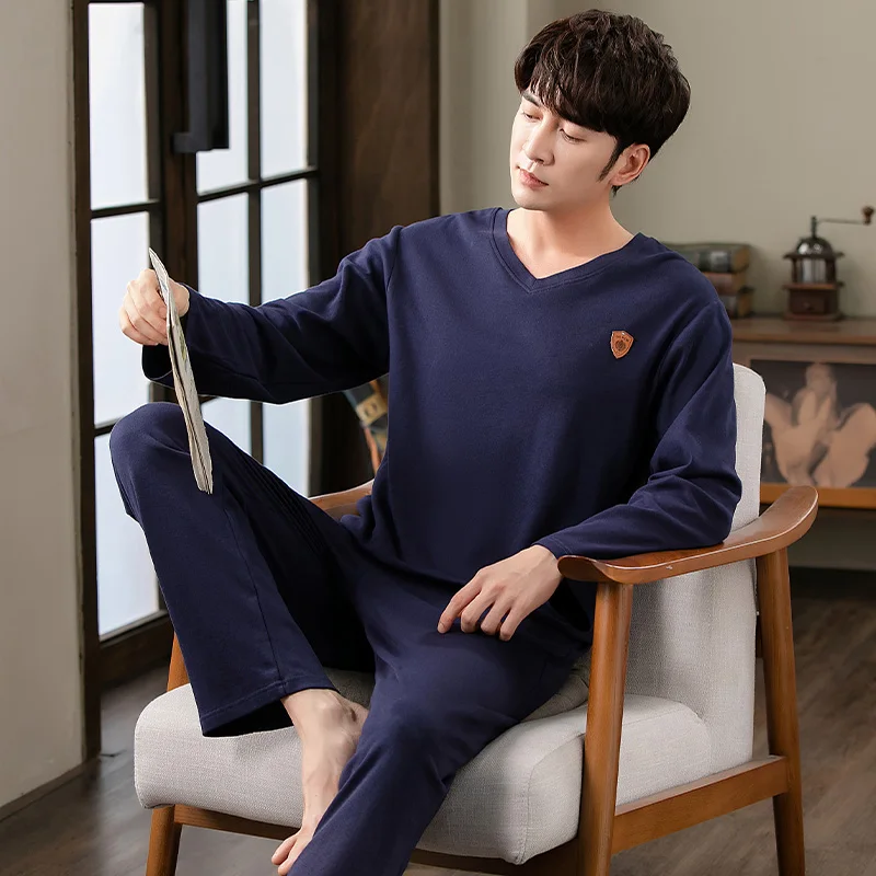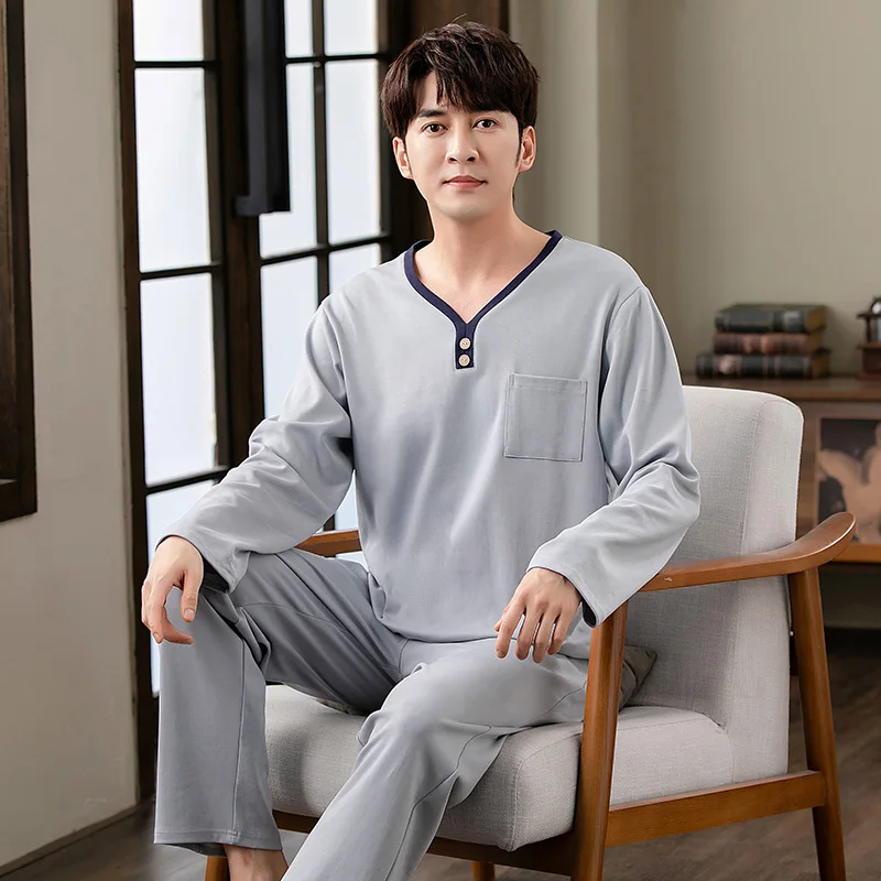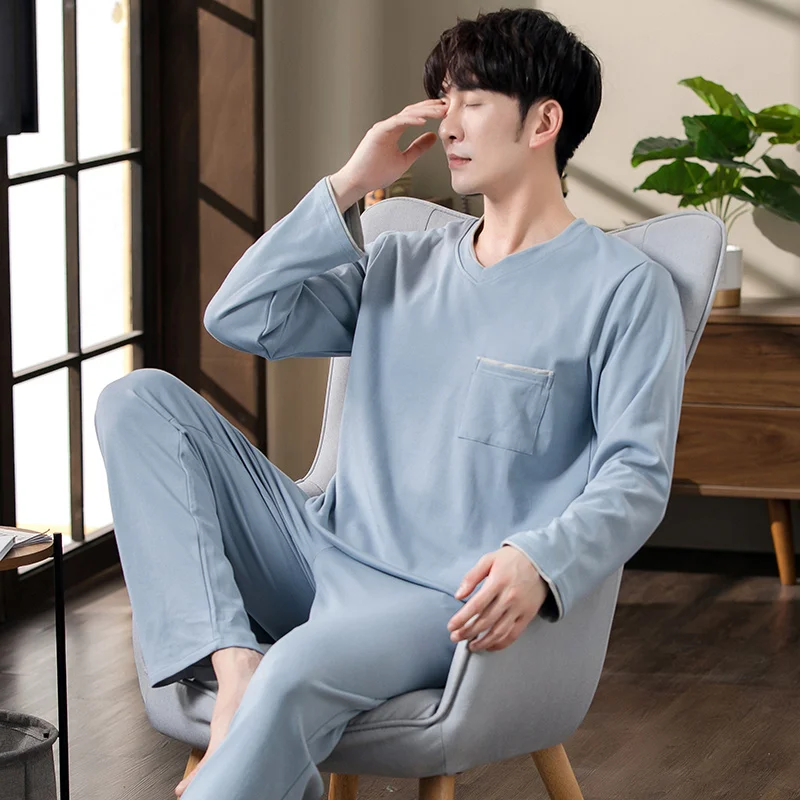 Ensemble pyjama en coton à col en v pour hommes, hauts à manches longues + pantalons longs, vêtements de nuit pour la maison, vêtements de nuit simples à la mode pour hommes, automne
