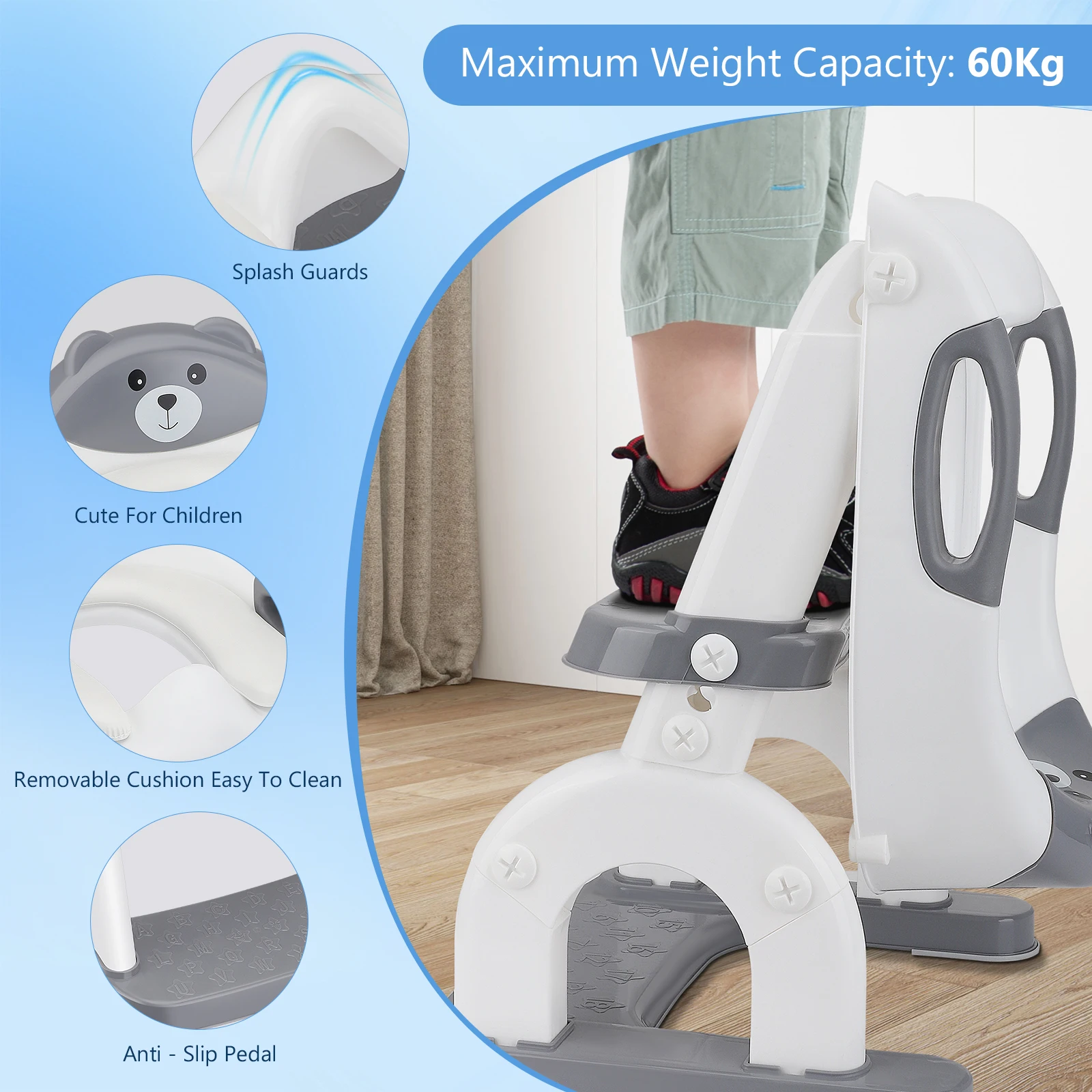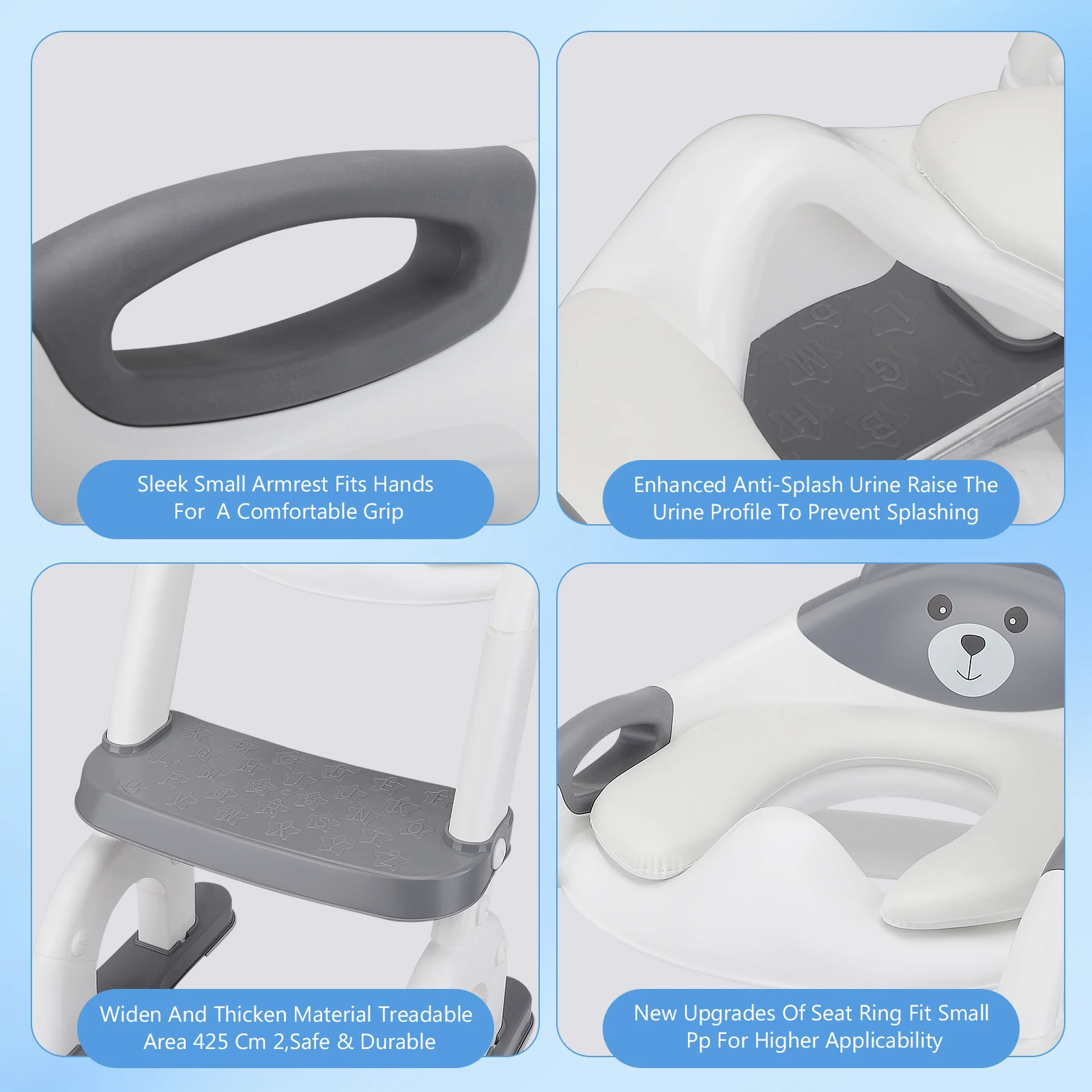 Structure triangulaire plus sûre : la base de construction triangulaire robuste et la conception antidérapante assurent la stabilité et préviennent les accidents.La surface des marches de ces escaliers de toilettes a été étendue jusqu'à 32 cm x 13,5 cm, votre enfant peut utiliser cet entraîneur de toilettes en toute confiance pour les tout-petits âgés de 1 à 3 ans sans souci.