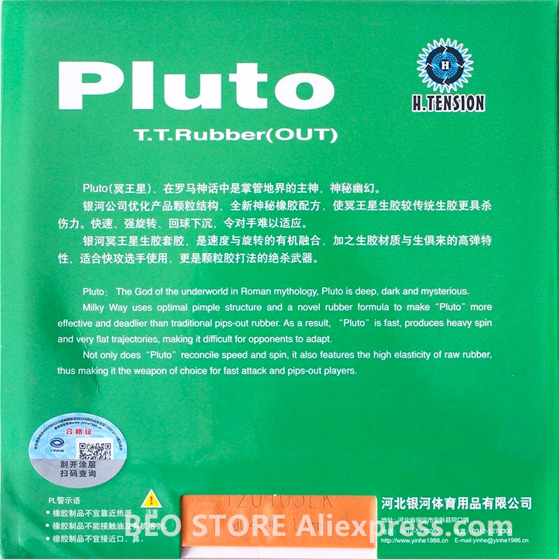 YINHE utilise une structure de bouton optimale et une nouvelle formule de caoutchouc pour rendre "Pluton" plus efficace et plus mortel que le caoutchouc pips-out traditionnel. En conséquence, "Pluton" est rapide, produit une rotation lourde et des trajectoires très plates, ce qui rend difficile l'adaptation des adversaires. Non seulement "Pluton" concilie vitesse et rotation, mais il présente également la haute élasticité du caoutchouc brut, ce qui en fait l'arme de choix pour les joueurs d'attaque rapide et de pips out.
