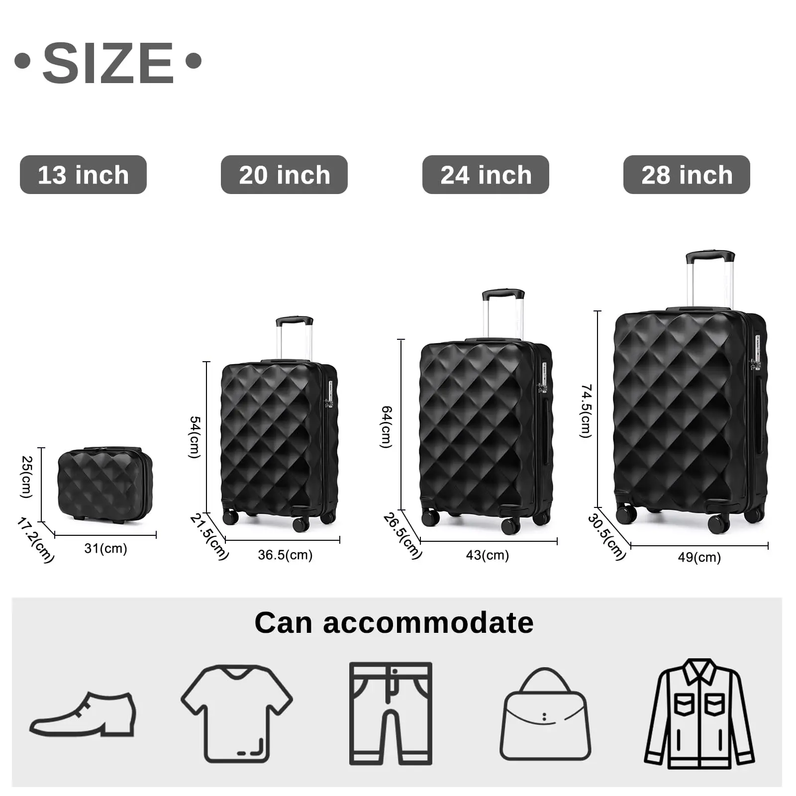 Les bûches de 13 pouces, 20 pouces, 24 pouces et 28 pouces peuvent être nichées les unes dans les autres.Un ensemble de valises est livré dans une boîte.Veuillez ouvrir la valise de 28 pouces pour inspection lorsque vous recevez le colis.