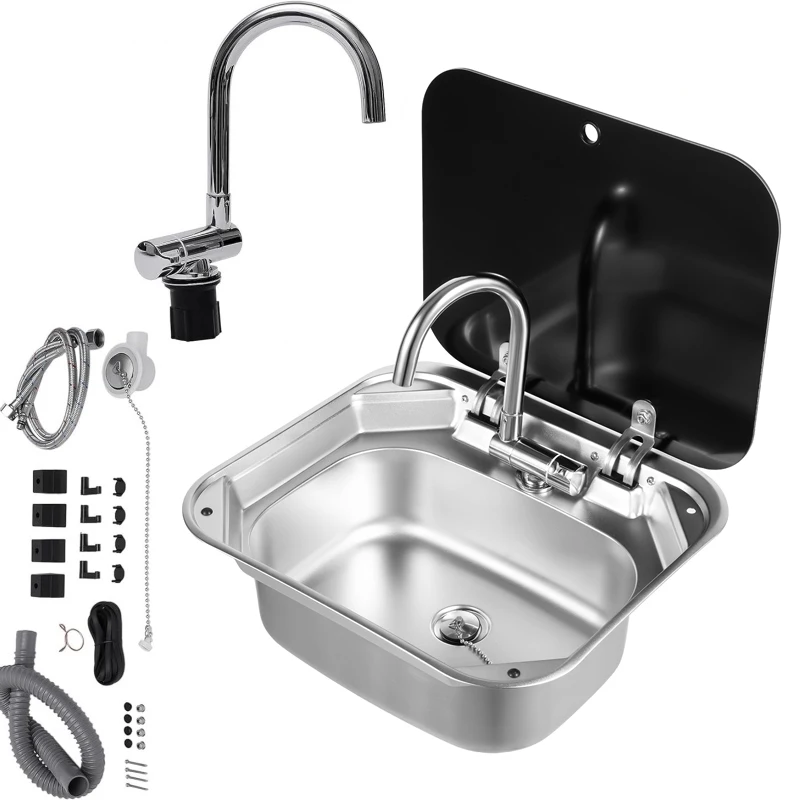 Il s'agit d'un kit complet d'évier pour camping-car avec un robinet, un évier, un tuyau d'entrée, un tuyau de vidange et des accessoires d'installation.Cet ensemble d'évier est conçu pour les camping-cars avec peu d'espace.Il est compact mais fonctionne bien pour un usage quotidien.Le matériau en acier inoxydable sûr et durable durera également longtemps.De plus, l'évier est équipé d'un couvercle rabattable et d'un robinet rétractable, peu encombrant.Bien qu'il soit de taille compacte, il est entièrement fonctionnel et constitue un excellent choix pour votre camping-car!