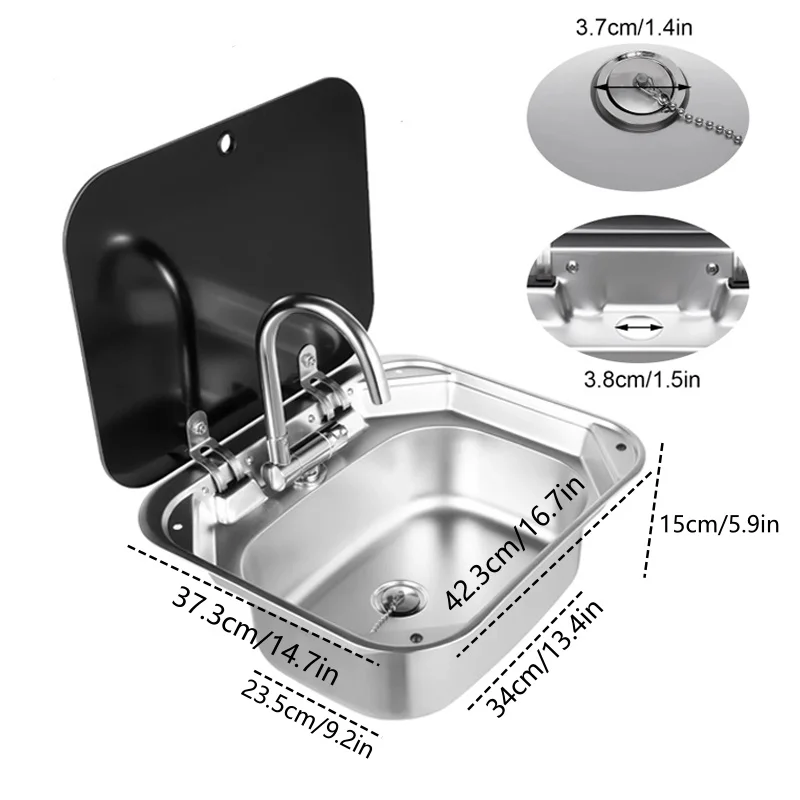 Taille compacte : la taille de cet évier est de 16,7 x 14,7 x 5,9 pouces, ce qui est très compact et adapté pour une utilisation dans la plupart des camping-cars où l'espace est limité.