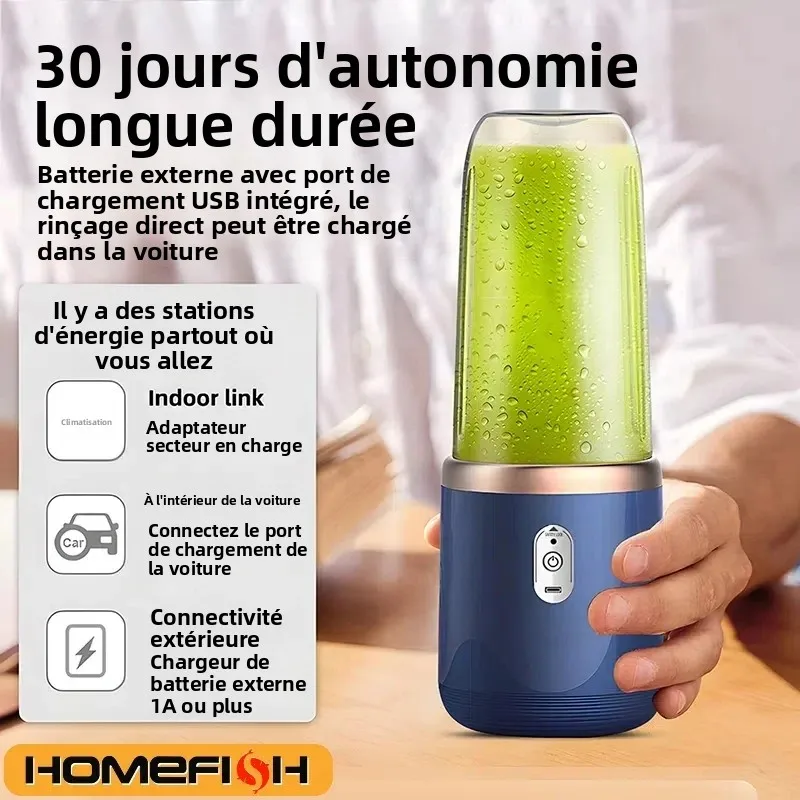A6. Le gobelet mixeur 800mAh nécessite un double-clic pour s'allumer ou s'éteindre, et non un simple clic.