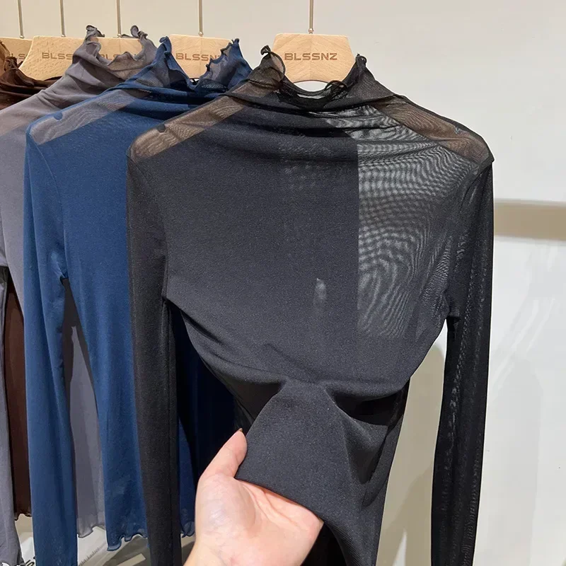 Femmes Sexy T-Shirt voir à travers des hauts en maille transparente à manches longues pure mince dames solide col roulé en soie T-Shirt dentelle haut court