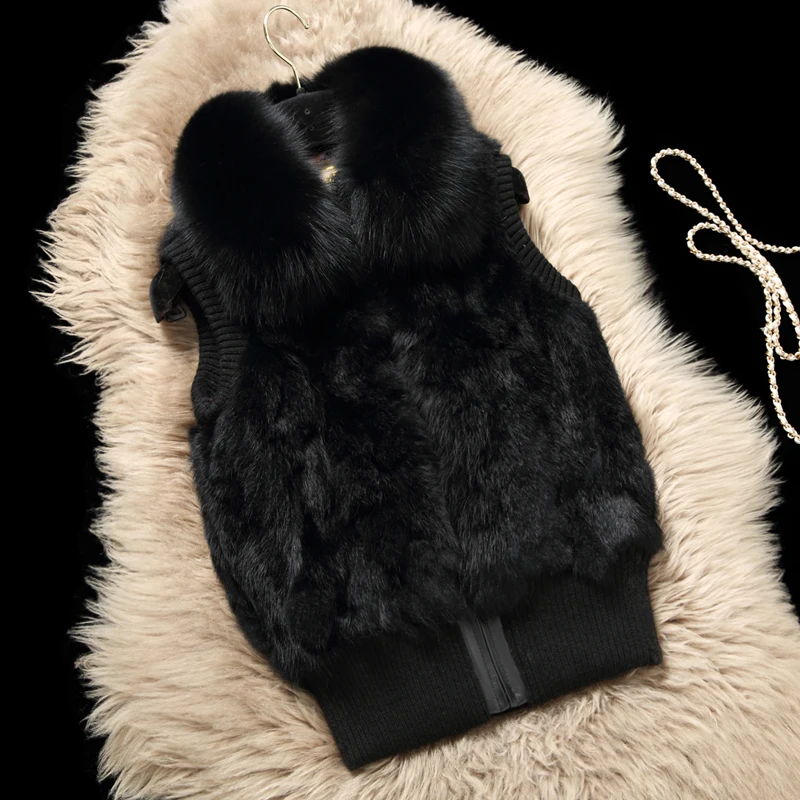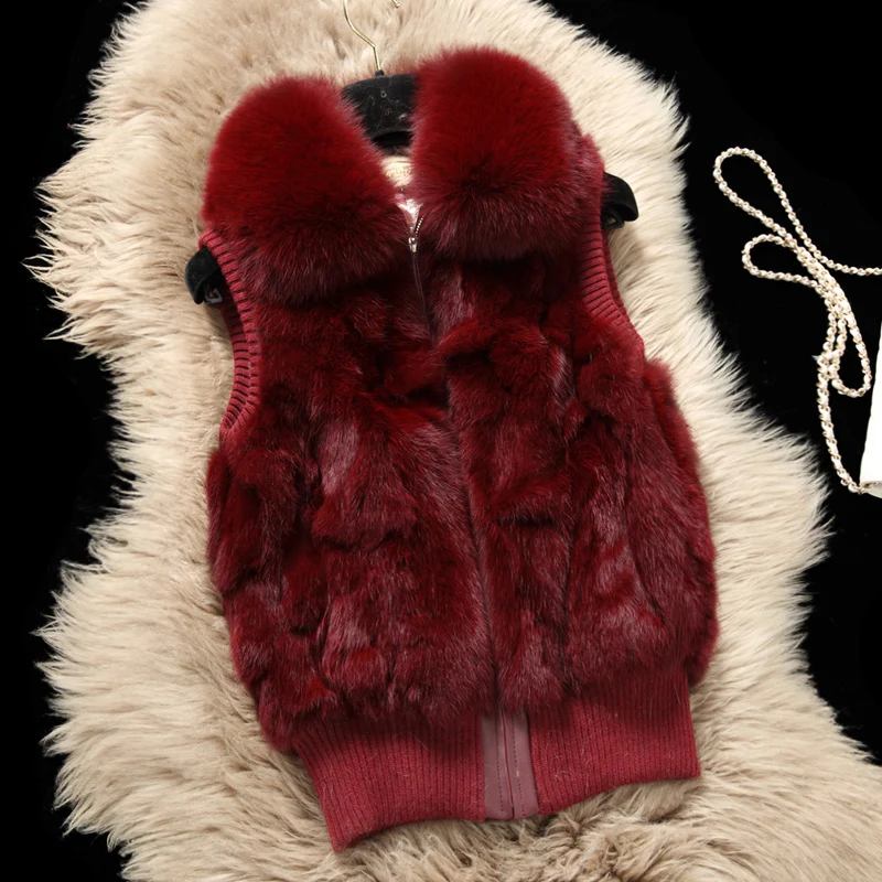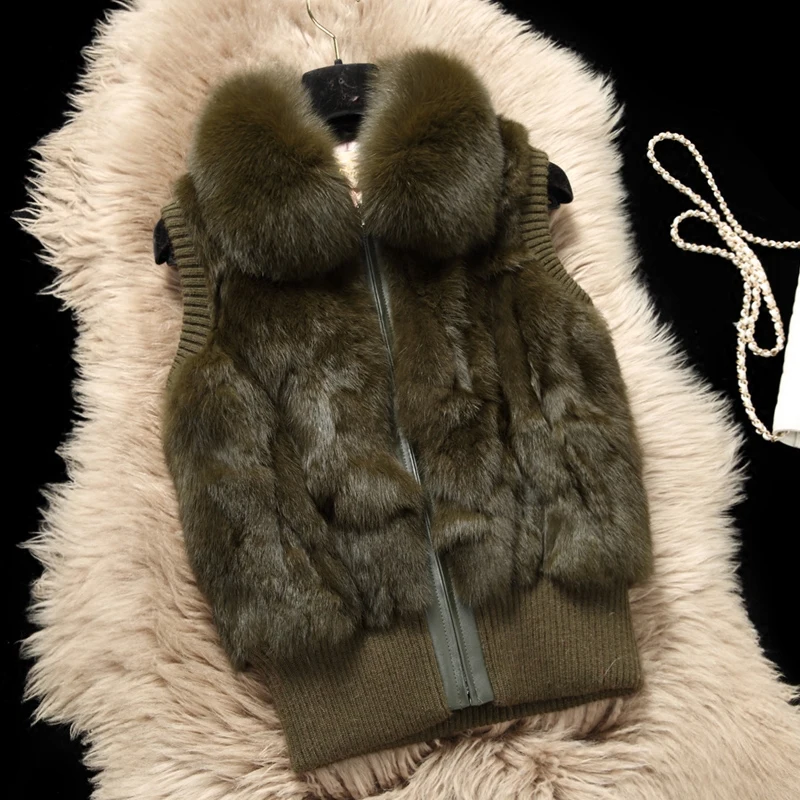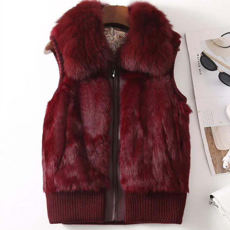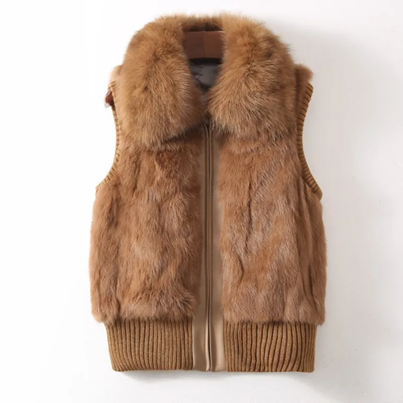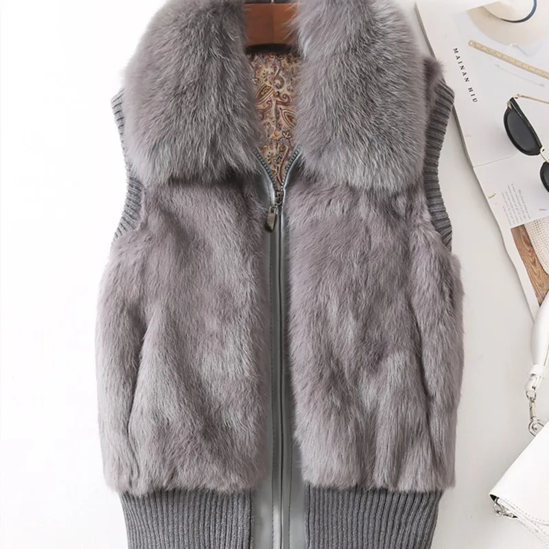 Femmes véritable fourrure de lapin col de fourrure de renard tricot femmes hiver gilet fourrure veste décontracté court vêtements d'extérieur mince avec fermeture éclair