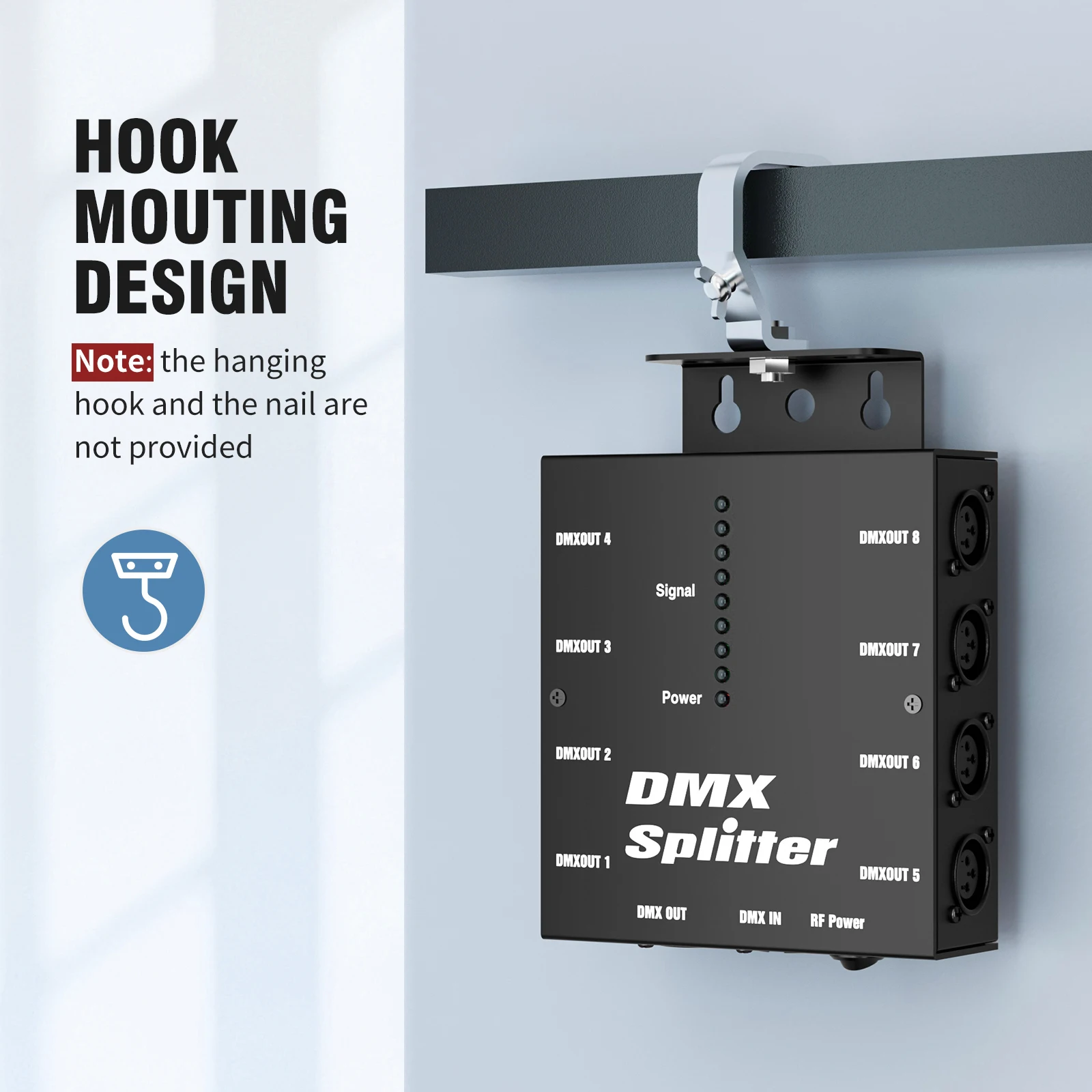 Branche de sortie de signal DMX : 1 port d'entrée/sortie direct, 8 sorties de signal DMX indépendantes
