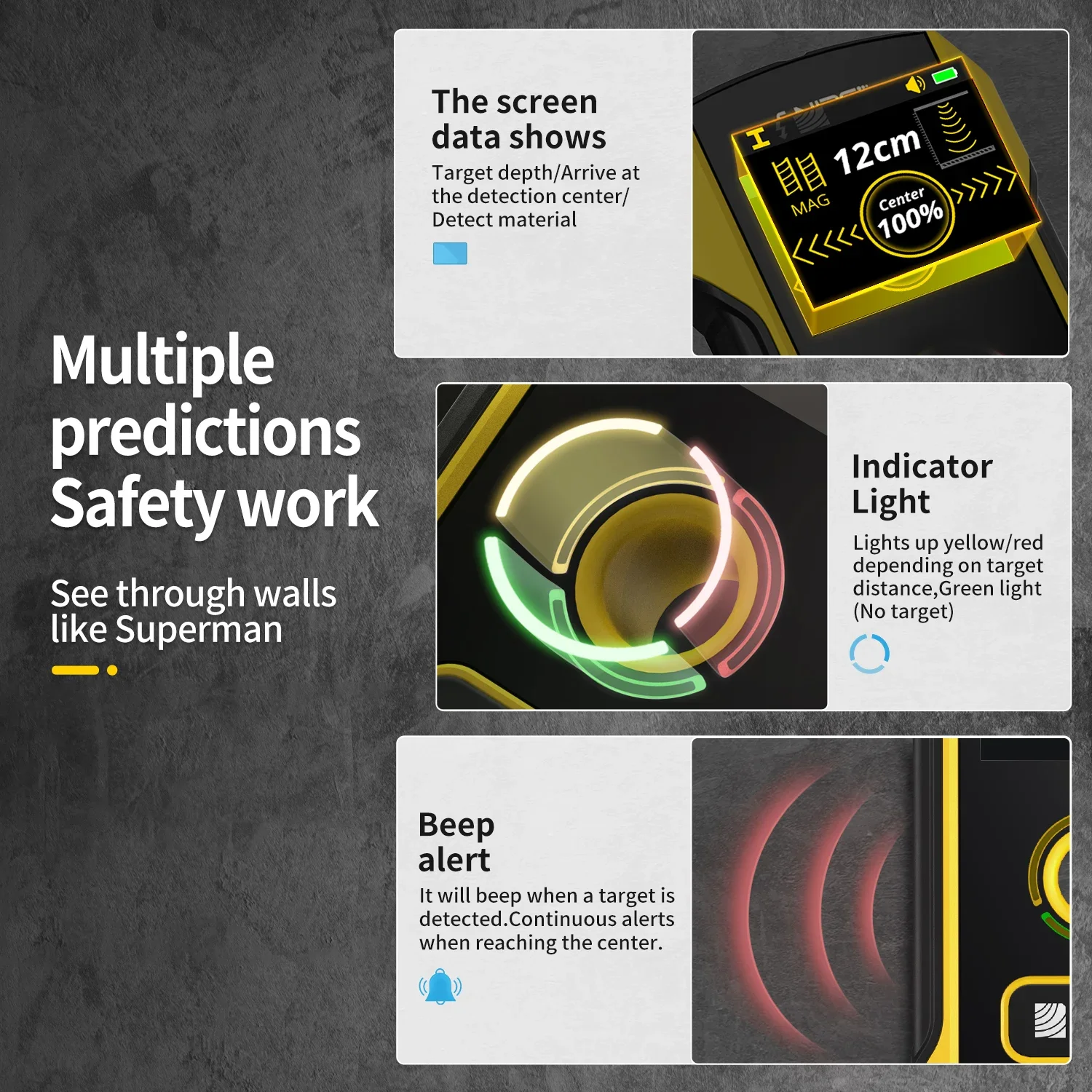 Prédictions multiples : l'écran affichera la profondeur cible, arrivera au centre de détection et au matériau, le voyant s'allumera en jaune ou en rouge en fonction de la distance cible, le voyant vert signifie aucun trajet.