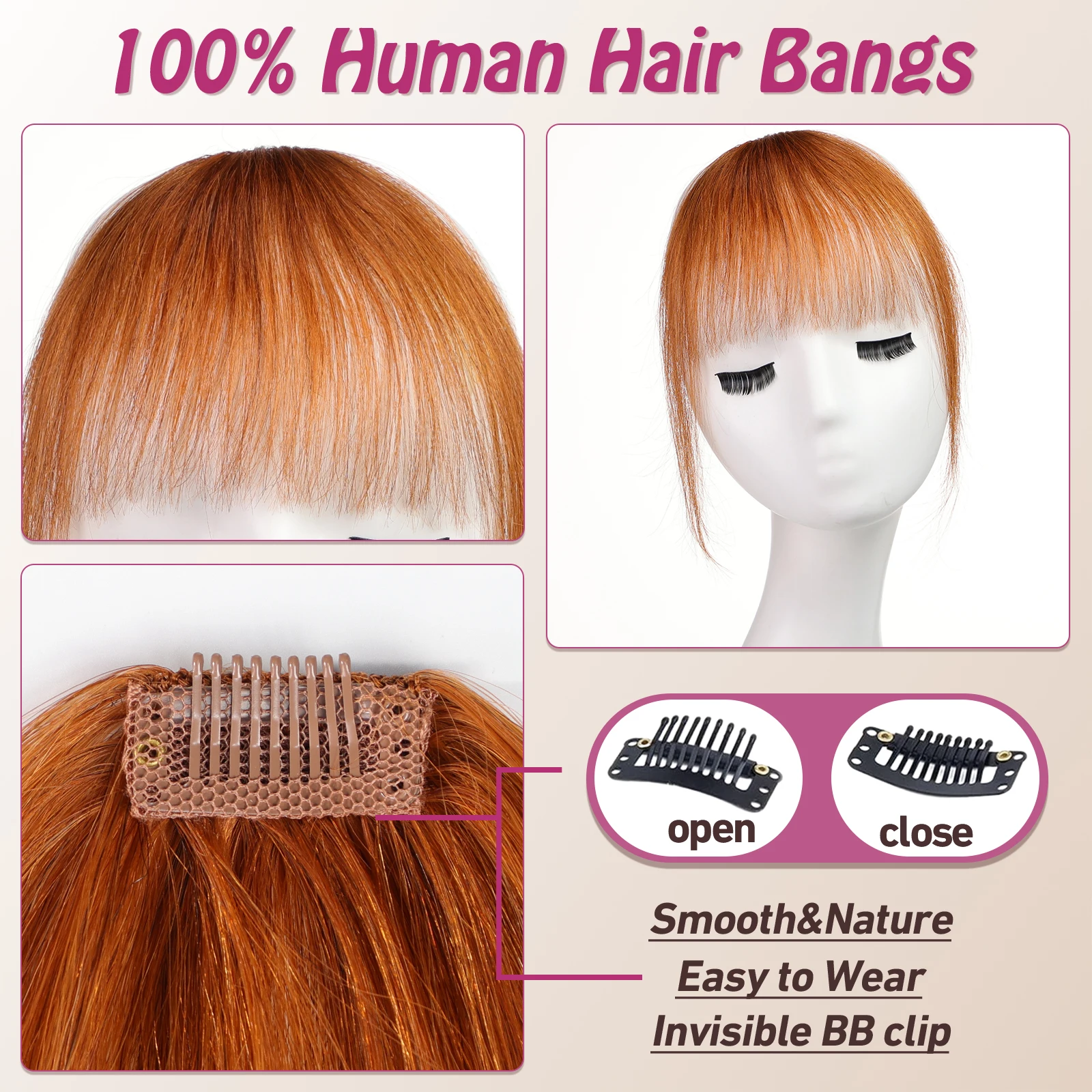 Pince à cheveux 100 % humains sur la frange, peut être bouclée, lissée ou teinte dans d'autres couleurs et styles à votre guise.Sans enchevêtrement, sans perte, sans odeur, propre, naturel, doux.