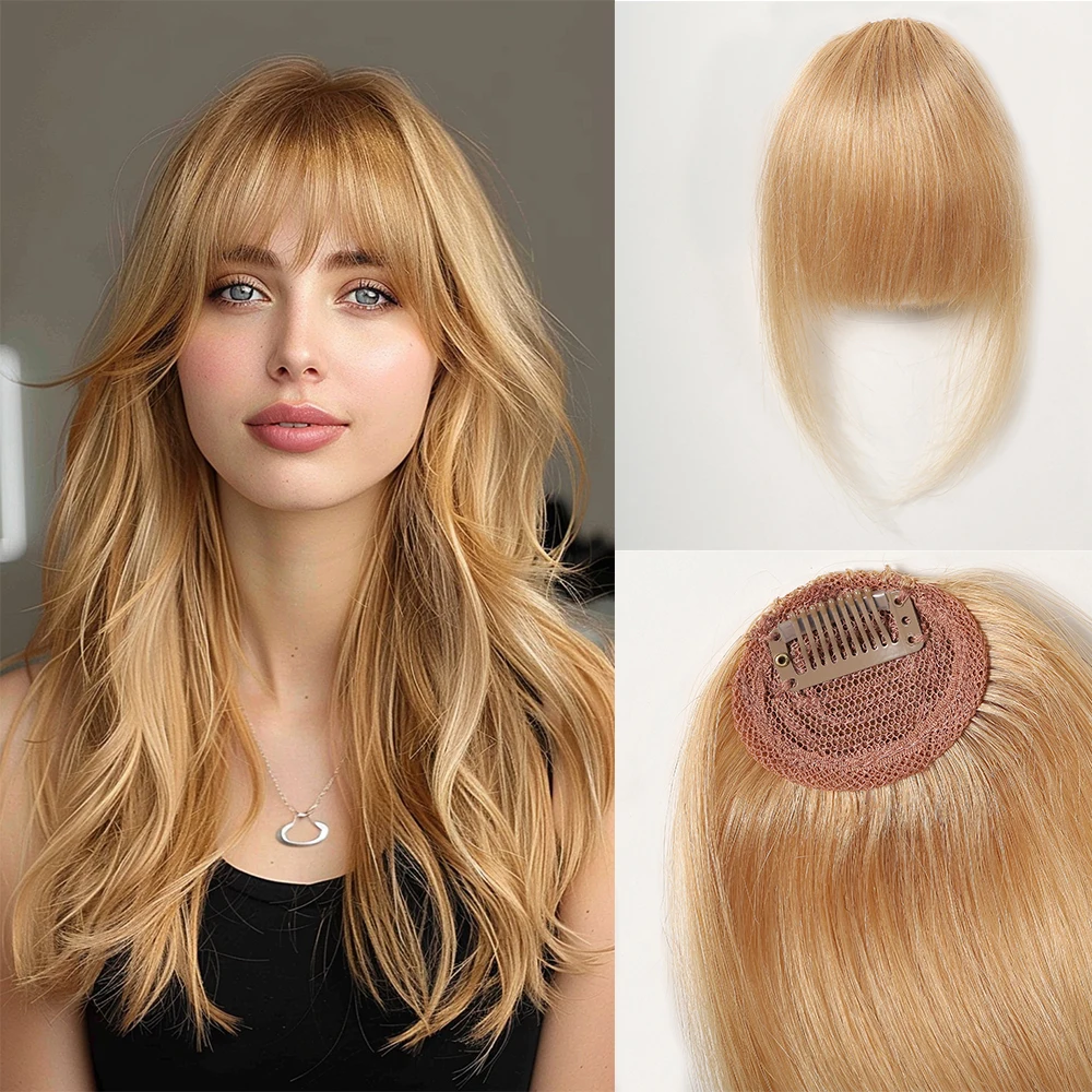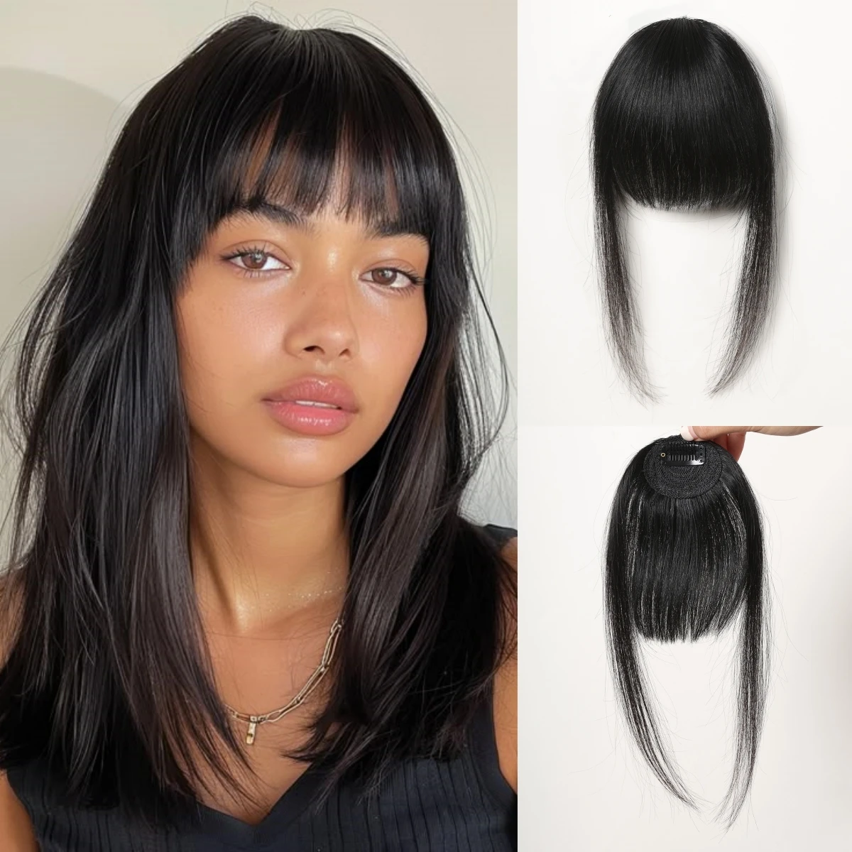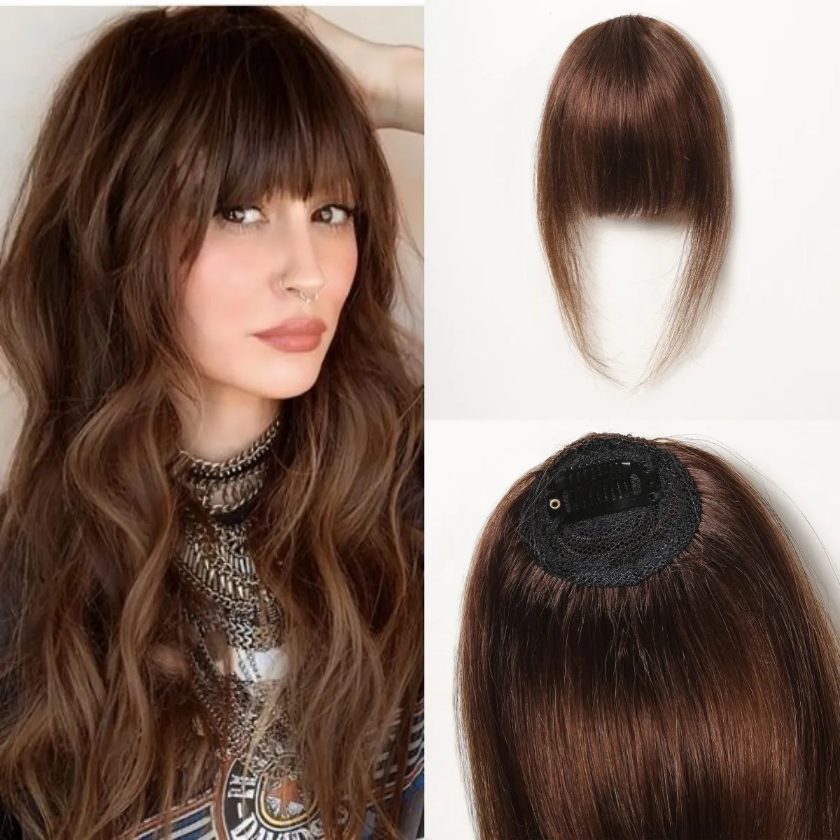 Frange à clipser 100% cheveux humains, coupe émoussée, frange vaporeuse avec favoris, aspect naturel brun foncé, pour femmes, usage quotidien de fête