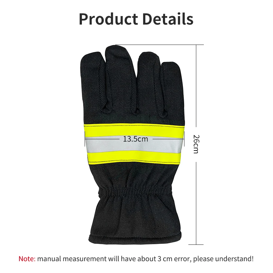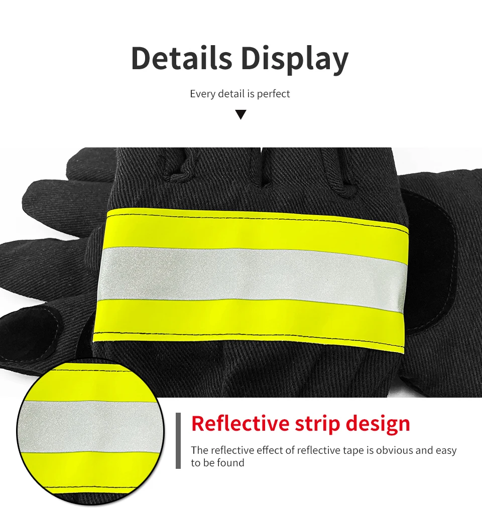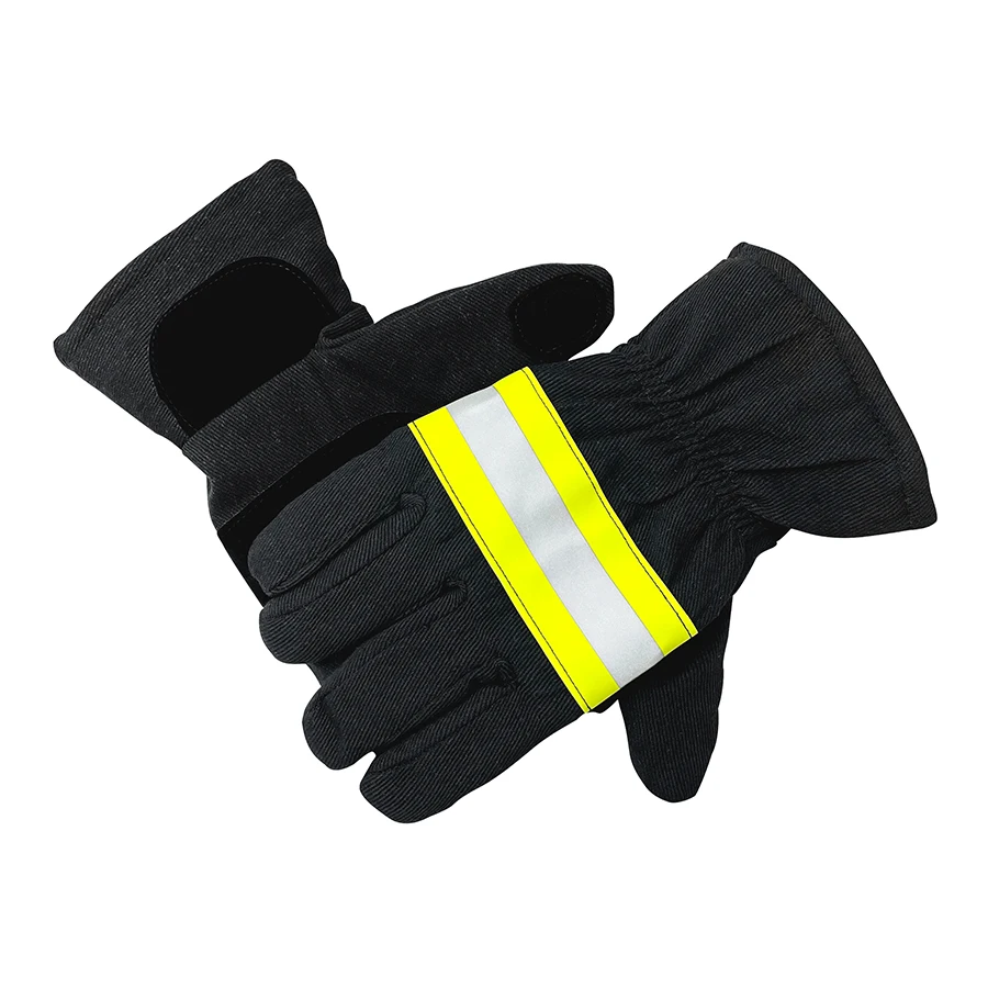 Gants ignifugés Structure et matériau Ces gants ignifugés sont composés d'une couche ignifuge et d'une couche d'isolation thermique, et sont très confortables. Domaine d'utilisation : principalement utilisés dans la lutte contre les incendies et les opérations de sauvetage pour protéger les mains et les poignets, ils protègent les mains des pompiers contre les dangers tels que les températures élevées, le rayonnement thermique et les objets tranchants.