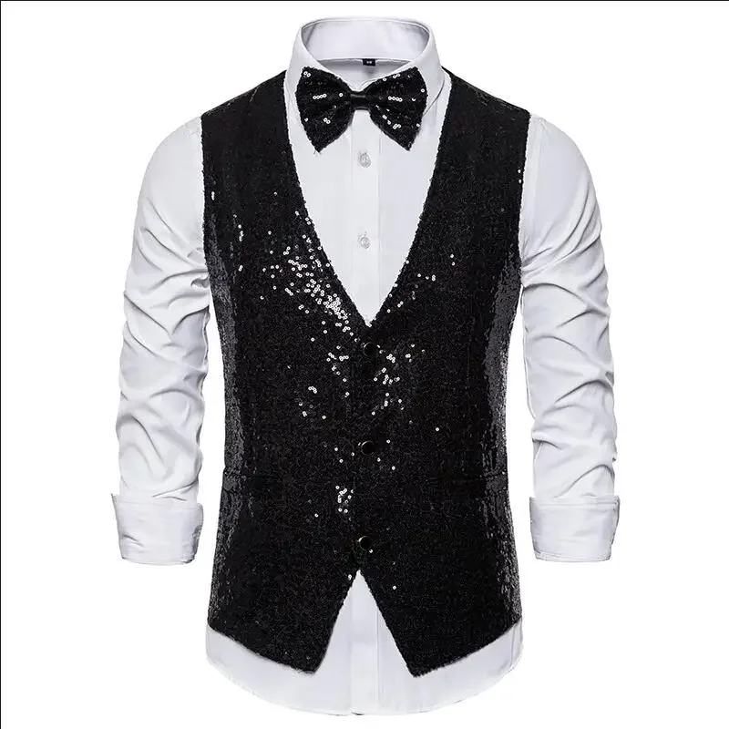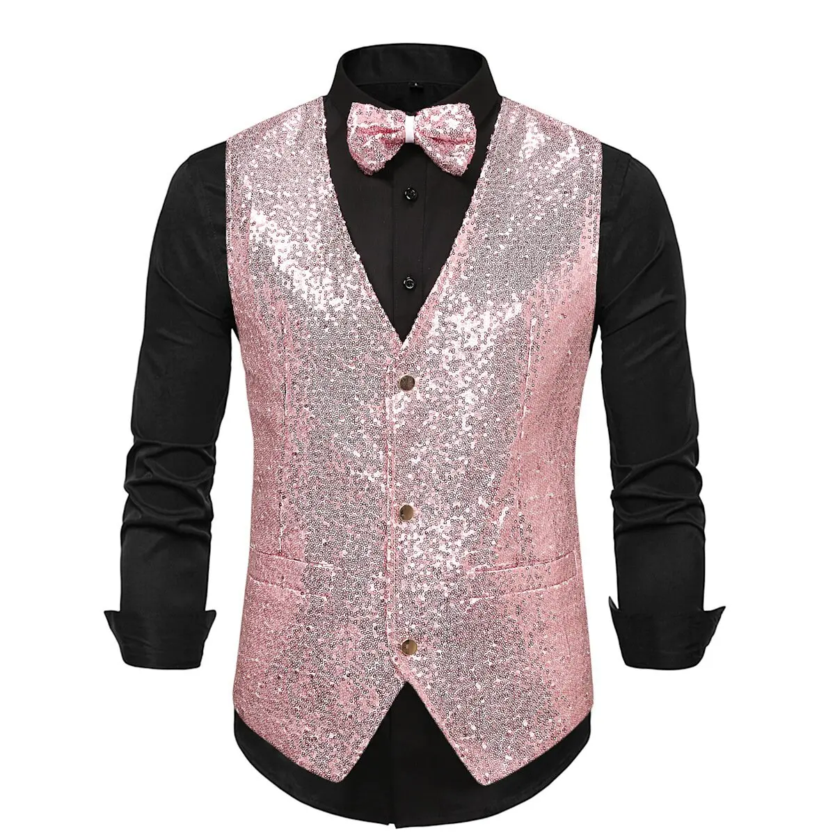 Gilet à paillettes vertes brillantes pour hommes, gilet moulant de Rotterdam, coupe couvertes, col en V, nœud papillon en émail, fête de mariage, scène, Rh, costume, 2 pièces