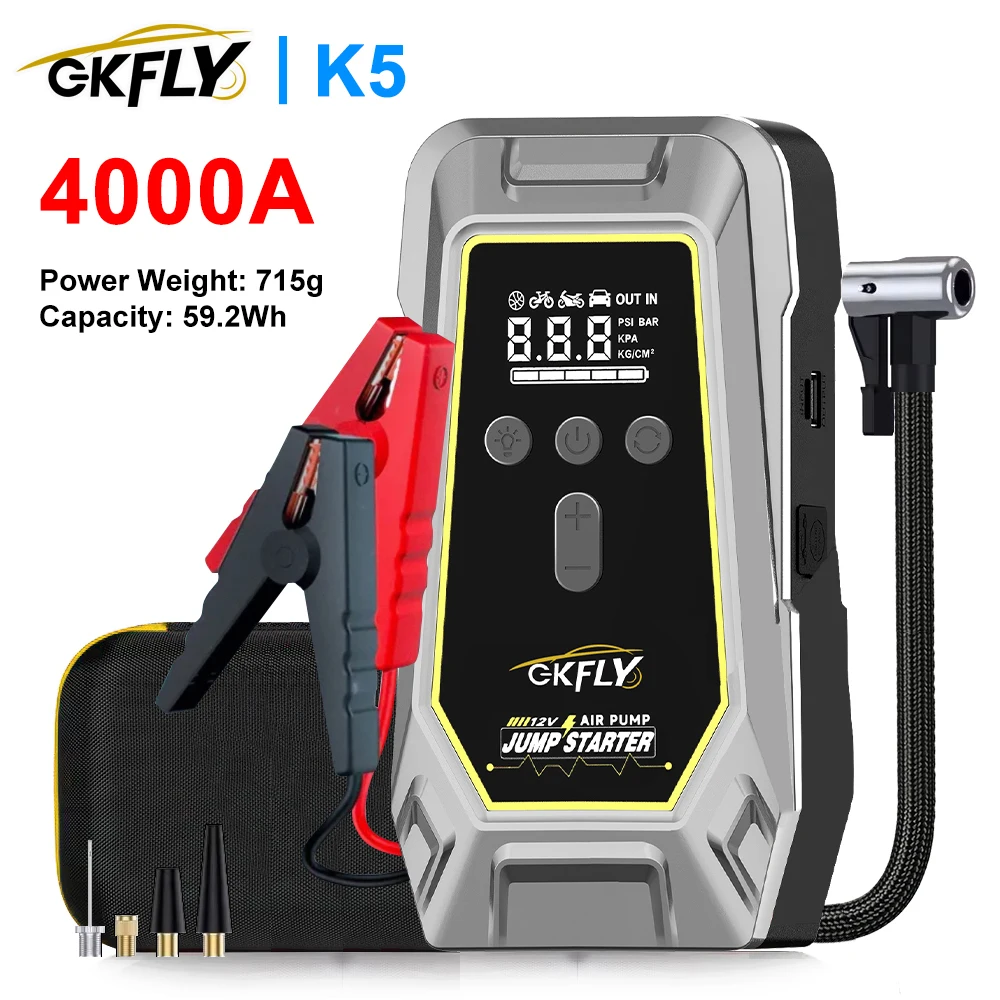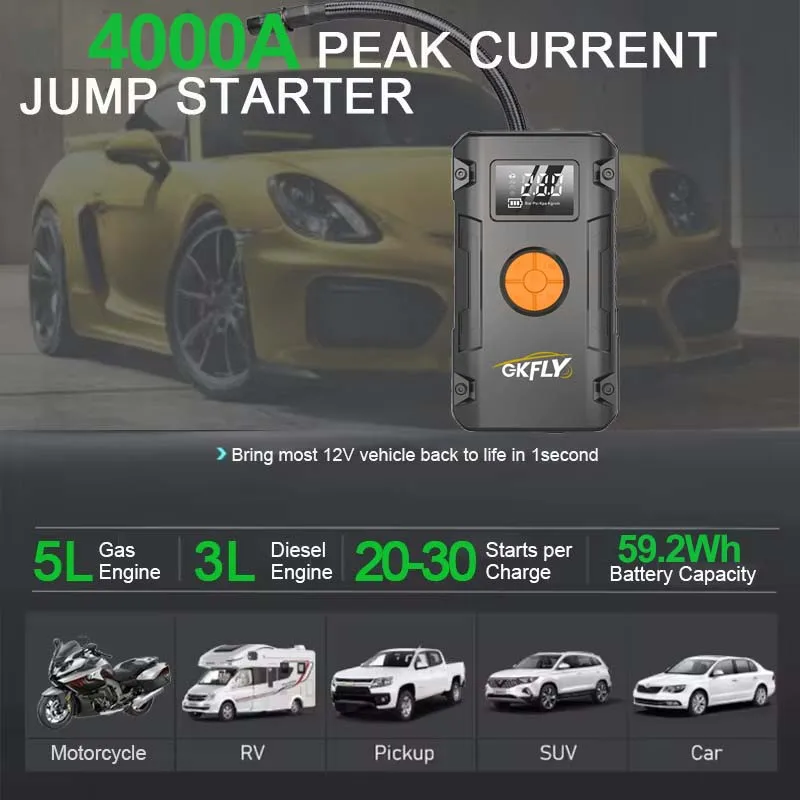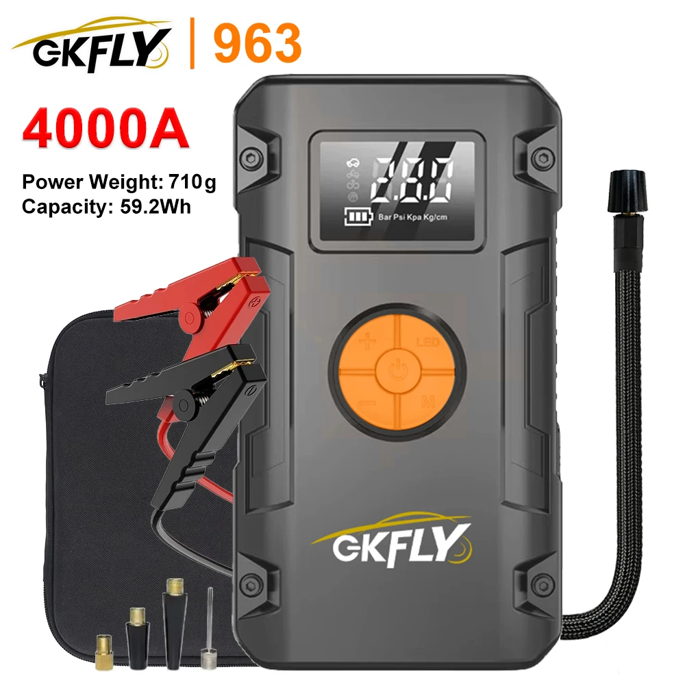 GKFLY 4000A Démarreur de voiture portable, batterie externe avec compresseur d'air, gonfleur de pneus 150 PSI, démarreur de batterie automobile pour voitures