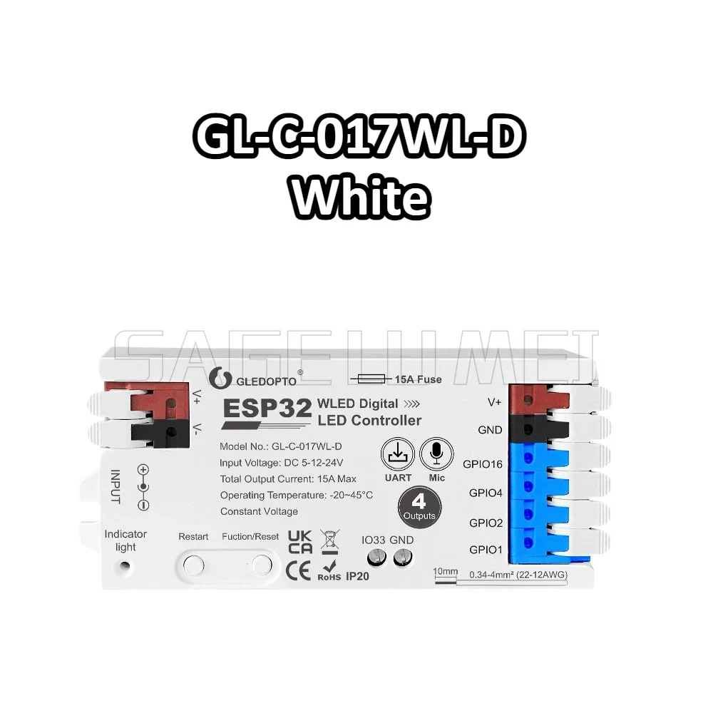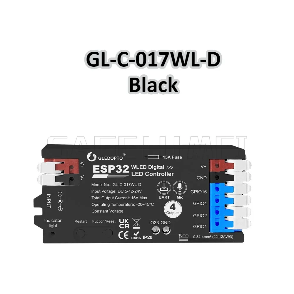 GLEDOPTO ESP32 WLED Contrôleur LED 4 sorties 15A Fusible Bulit dans Microphone Dynamique USB-C UART Relais d'économie d'énergie 5V Shifter de niveau GLEDOPTO NOUVEAU contrôleur LED ESP32 WLED avec sorties 4 canaux, téléchargement USB-C UART, microphone intégré, relais d'économie d'énergie, circuit intégré de levier de vitesse de niveau Contrôle indépendant à 4 canaux Conduisez facilement et contrôlez individuellement 4 bandes LED (WS2811/2812, SK6812, WS2815, etc.)pour des effets d'éclairage multizone.(besoin de configurer un contrôle segmenté dans l'application wled) Synchronisation musicale et plus de 100 effets dynamiques Micro intégré pour un éclairage réactif au son, plus de 100 effets (arc-en-ciel, feu, météore, etc.)via l'application WLED. Sécurité et efficacité énergétique Fusible 15 A pour une protection contre les surintensités, un relais de mise hors tension automatique et un circuit intégré de changement de niveau pour une transmission de signal stable. Mises à jour faciles du micrologiciel et compatibilité étendue Mises à niveau du micrologiciel sans fil (application WLED) ou filaire (UART) ; prend en charge les protocoles LED adressables populaires Conception compacte et conviviale Ports de câblage clairs, performances alimentées par ESP32, idéales pour les projets d'éclairage domestiques, commerciaux et professionnels. Numéro de modèle.: GL-C-017WL-D Tension d'entrée : DC 5-12-24 V. Courant de sortie total : 15 A maximum Protocole : WiFi Couleur du contrôleur: blanc/noir/orange Matériel: PC ignifuge Température de fonctionnement : -20 ~ 45℃ Type de fil suggéré : 0,34-4 mm2 (22-12 AWG) Longueur de dénudage : 10 mm N.w.: 53,4g G.W.: 86,6g Taille: 108x4518mm 1 pièces * contrôleur de bande ESP32 WLED 1 pièces * manuel d'utilisation