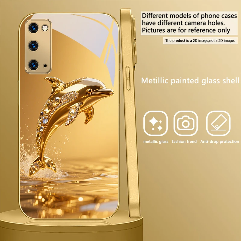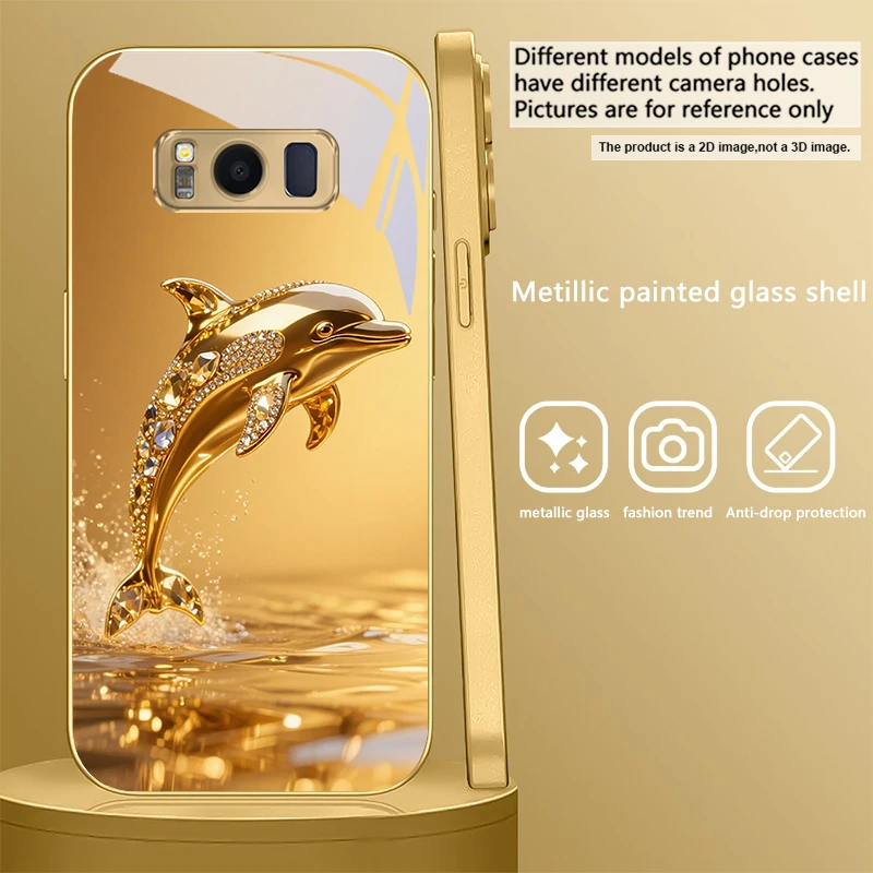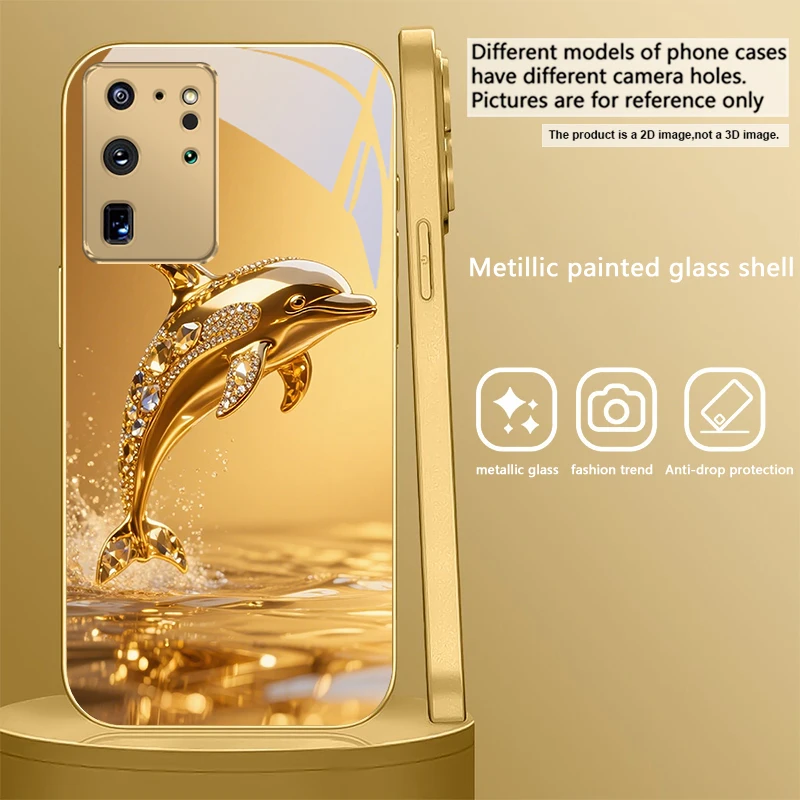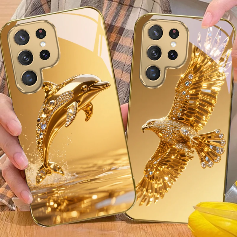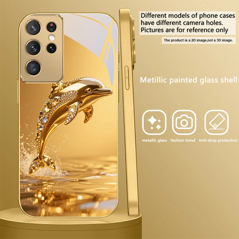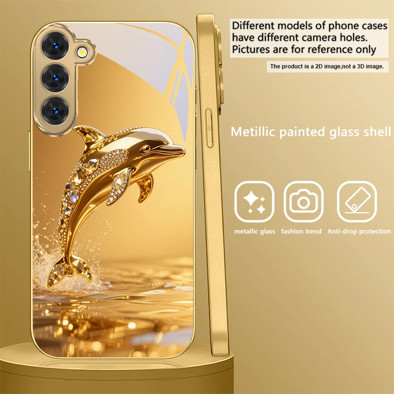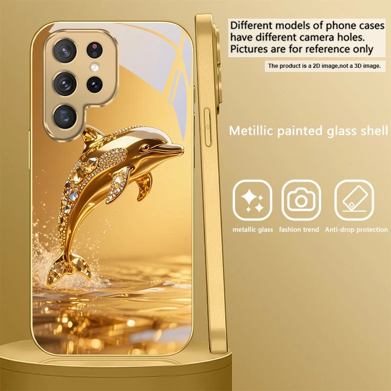 Golden dolphin For Samsung Galaxy S20 FE S21Plus S22 23 Plus S24 Ultra 25Ultra S21+ S9+ 22Plus S22+ Golden glass phone case