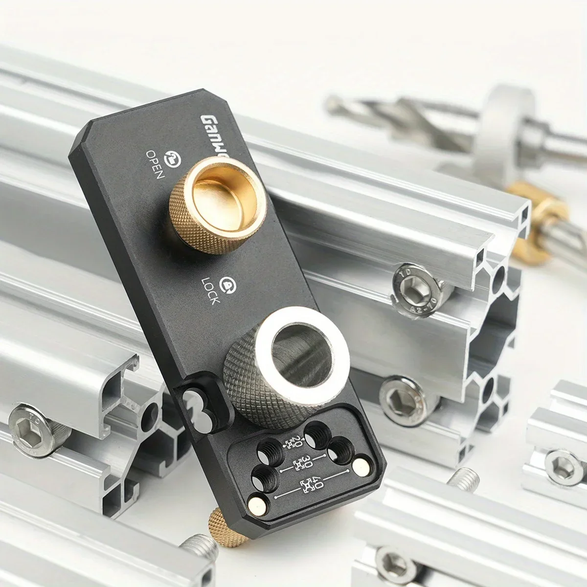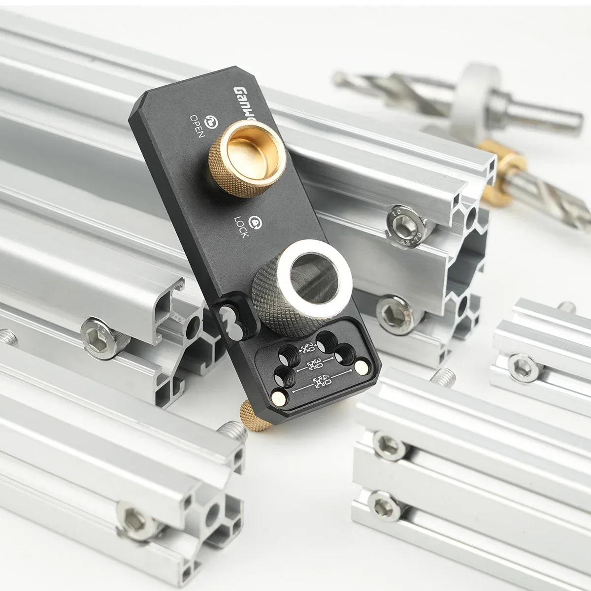 Faites glisser le produit dans le profilé en aluminium, contre le pilier en cuivre. Verrouillez les vis en laiton et utilisez la perceuse étagée pour percer les trous.