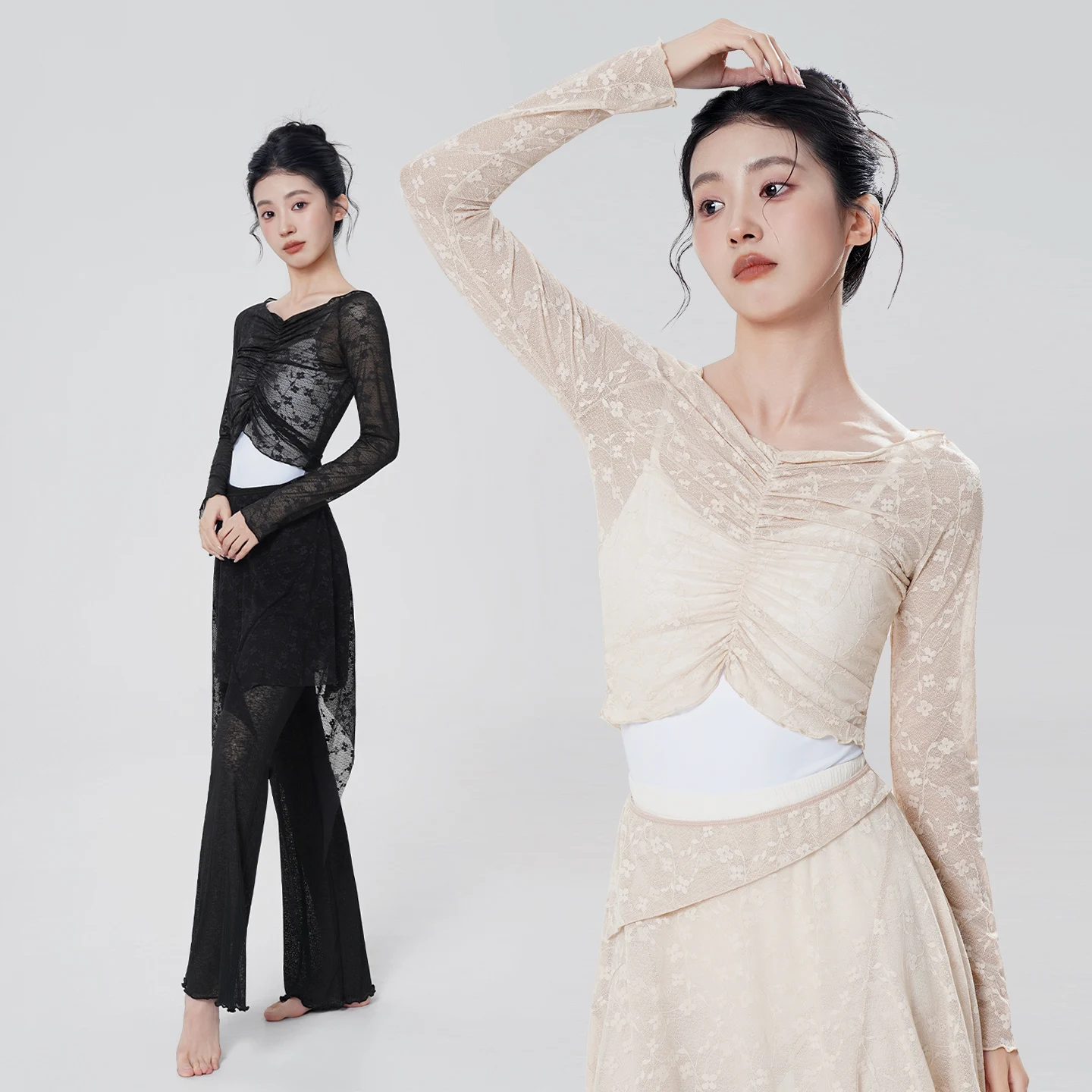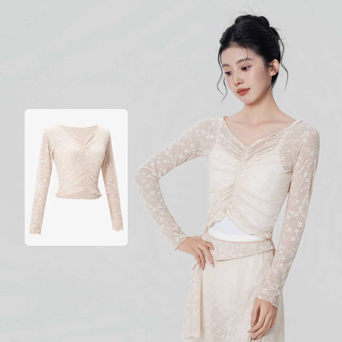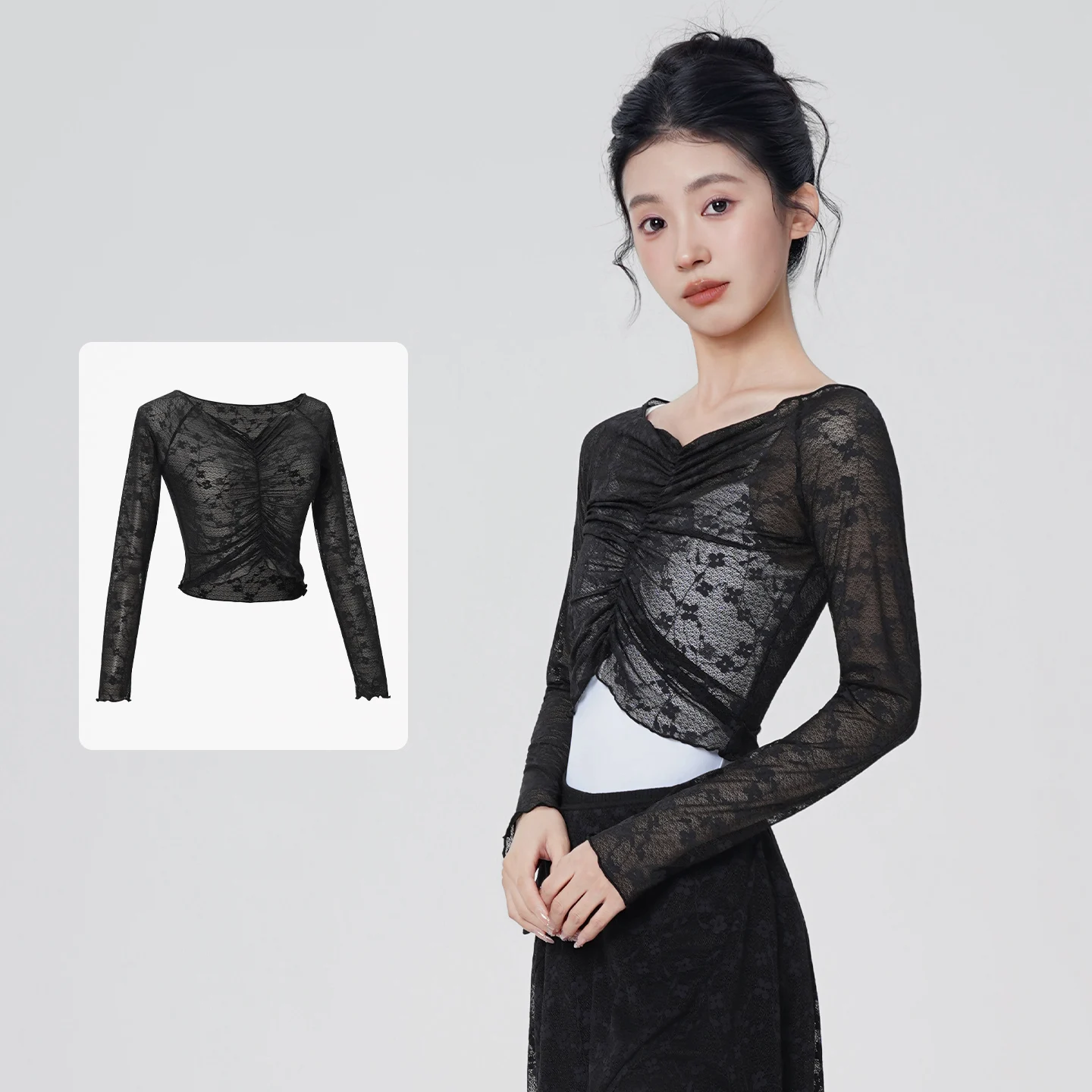 Haut de danse en dentelle pour femmes, haut plissé sur la poitrine, manches longues, tenue de danse moderne, pour adultes et adolescents, gymnastique, Yoga, entraînement, chemisier imprimé