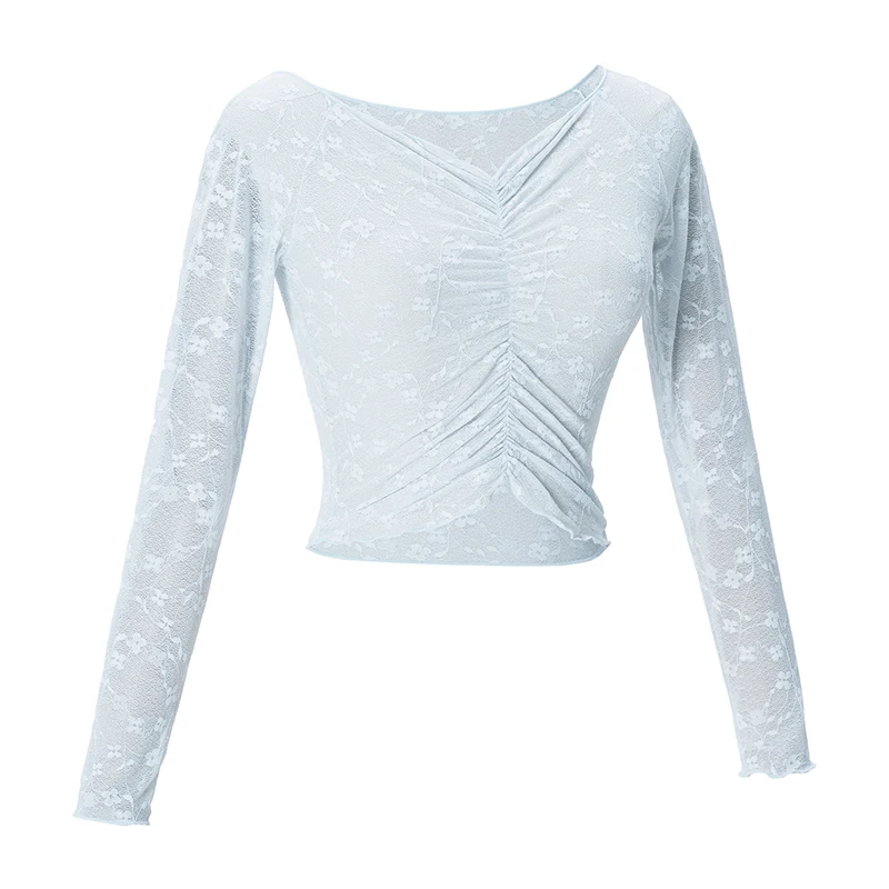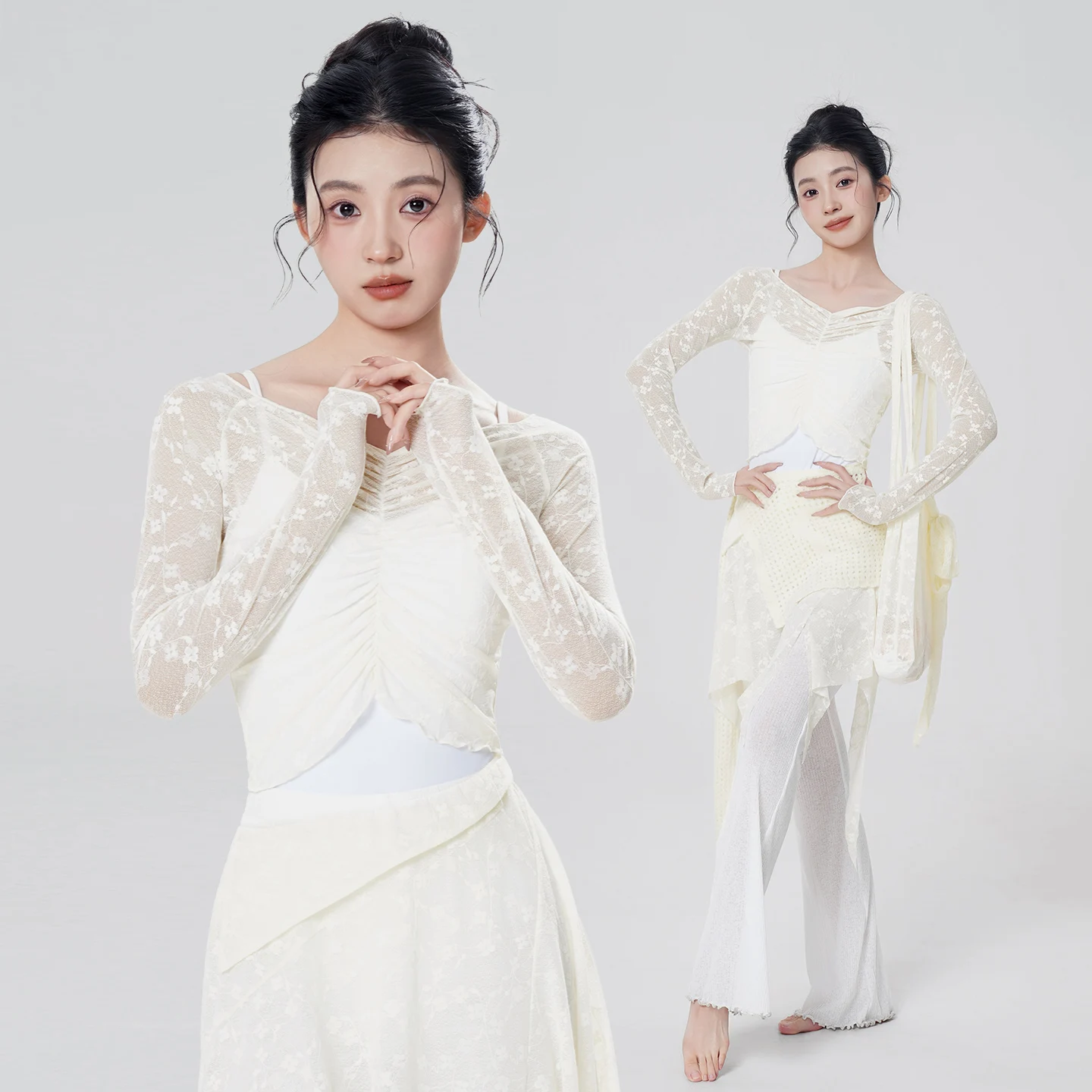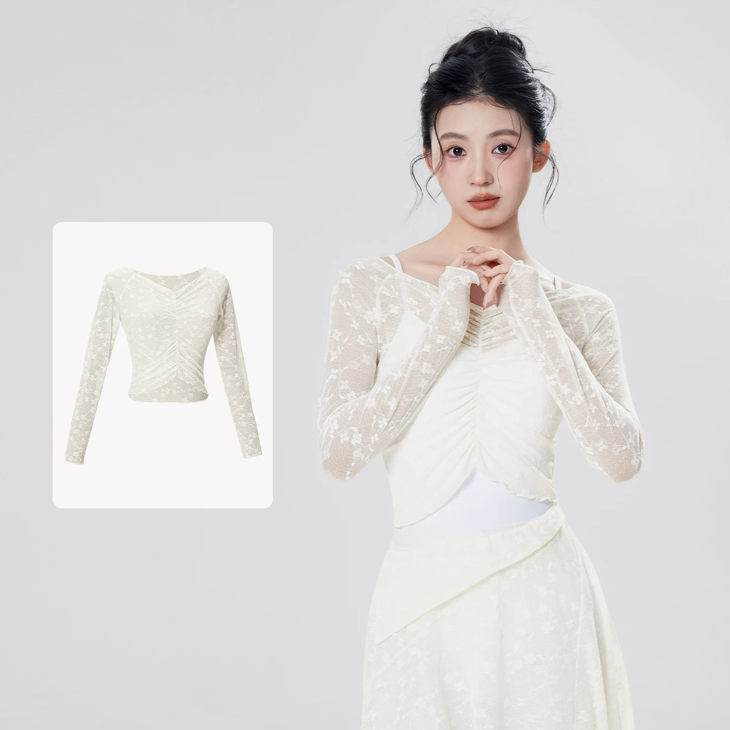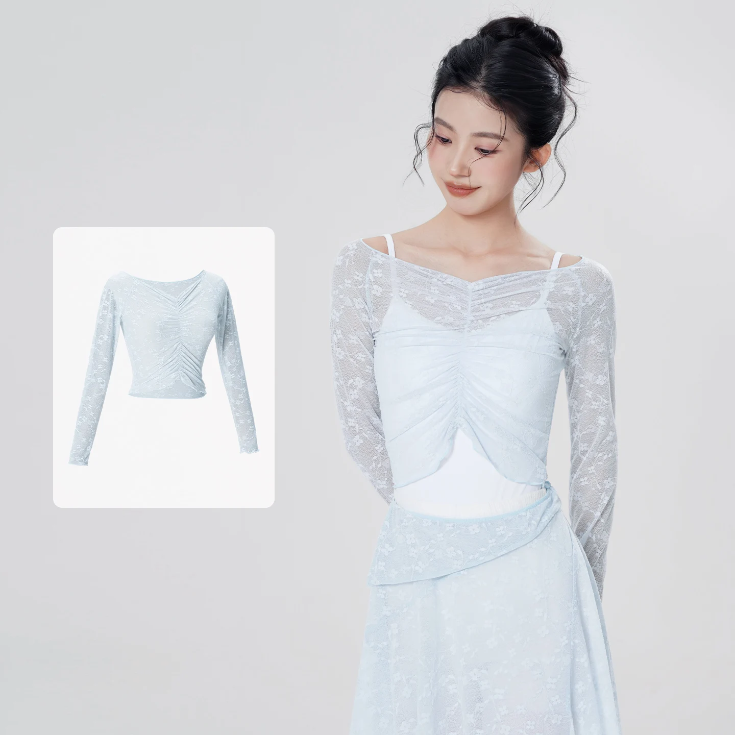 Haut de danse en dentelle pour femmes, haut plissé sur la poitrine, manches longues, tenue de danse moderne, pour adultes et adolescents, gymnastique, Yoga, entraînement, chemisier imprimé