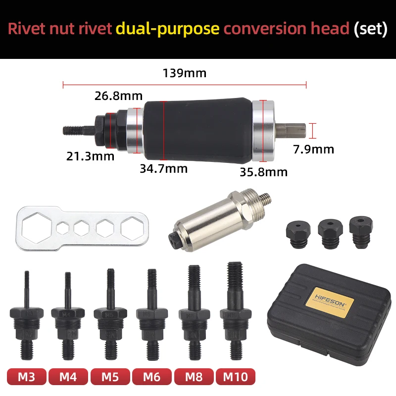 HIFESON M3M4M5M6M8M10 crous à rivets à double usage Pistolet Rivets aveugles Riveteuse Adaptateur électrique Outil de rivetage pour 2.4mm 3.2mm 4.0mm 4.8mm