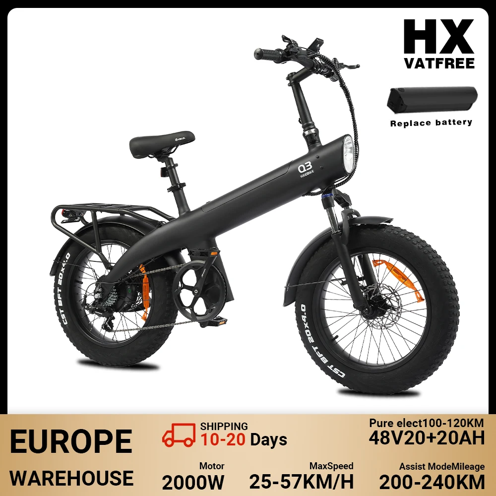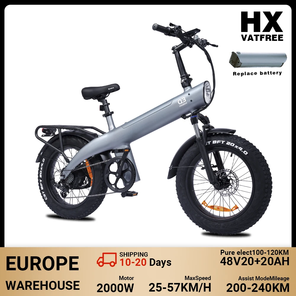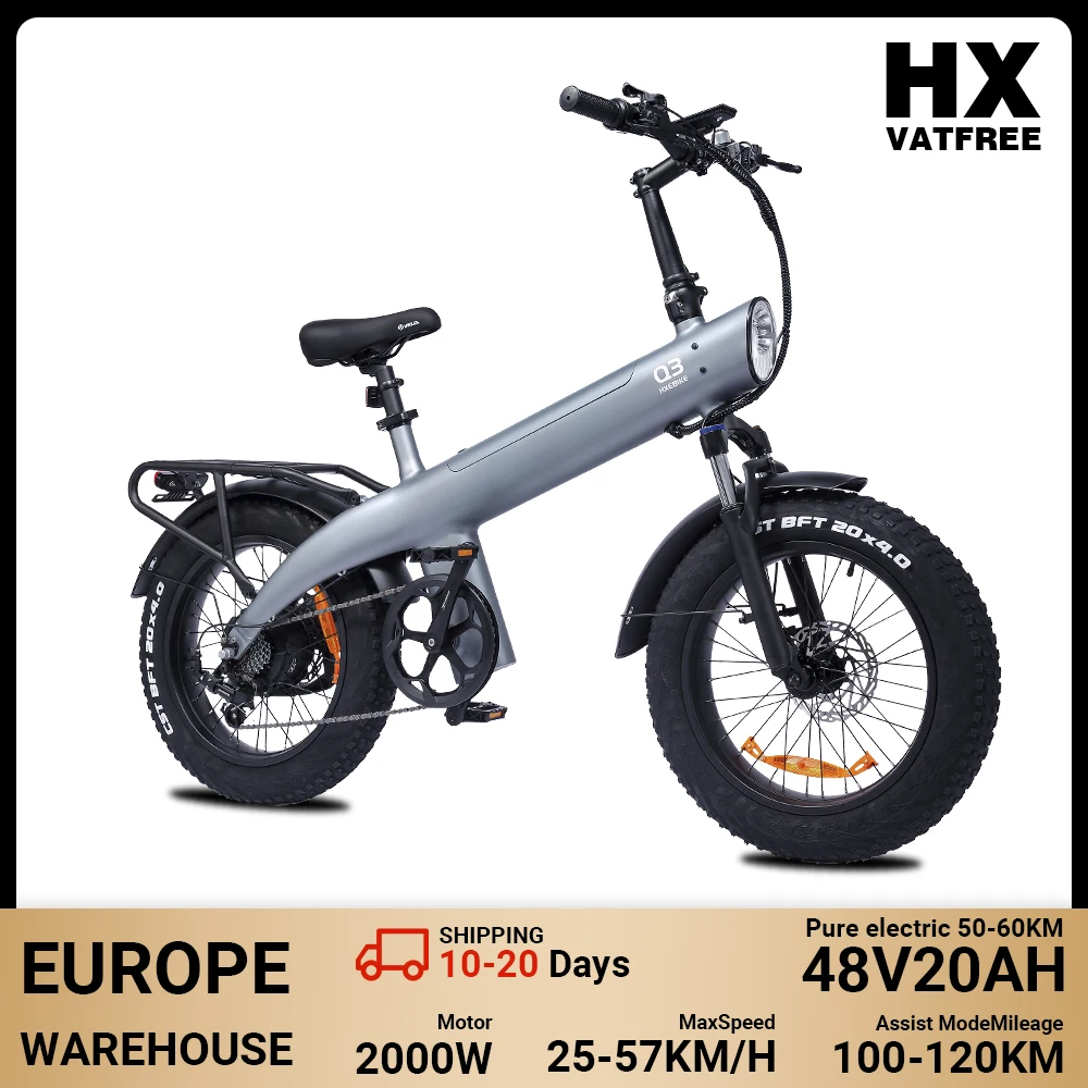 Vélo électrique pour adultes HX Q3 2000W 48V 20AH, vélo électrique 115N.m, vélo électrique à gros pneus 20 pouces, batterie amovible, vélo électrique pliable