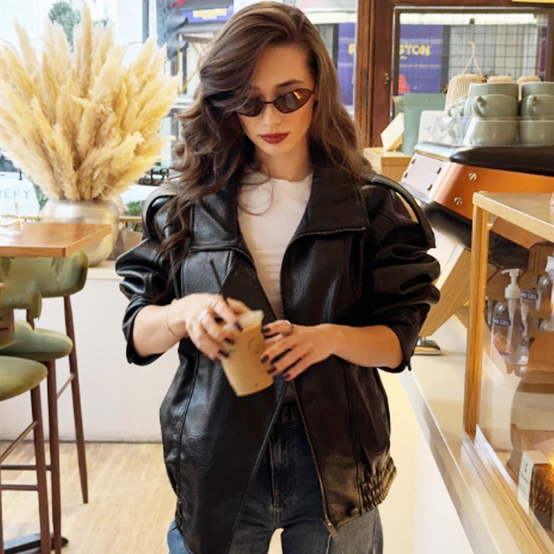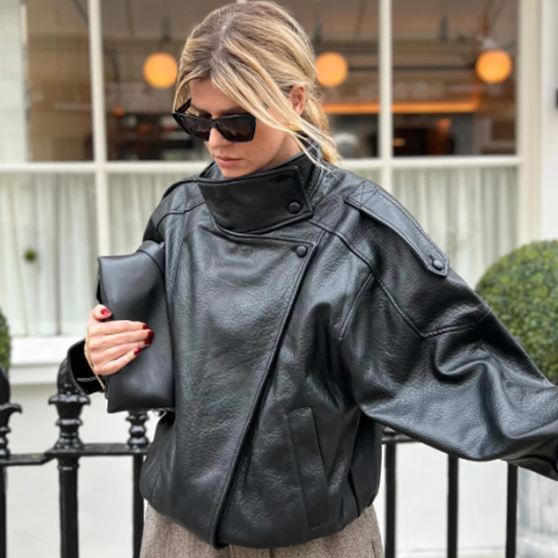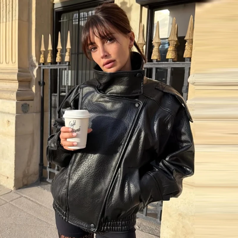 HXAO nouveauté femmes Bomber veste en cuir noir vestes recadrée surdimensionné vêtements d'extérieur fermeture éclair à manches longues manteaux veste extérieure