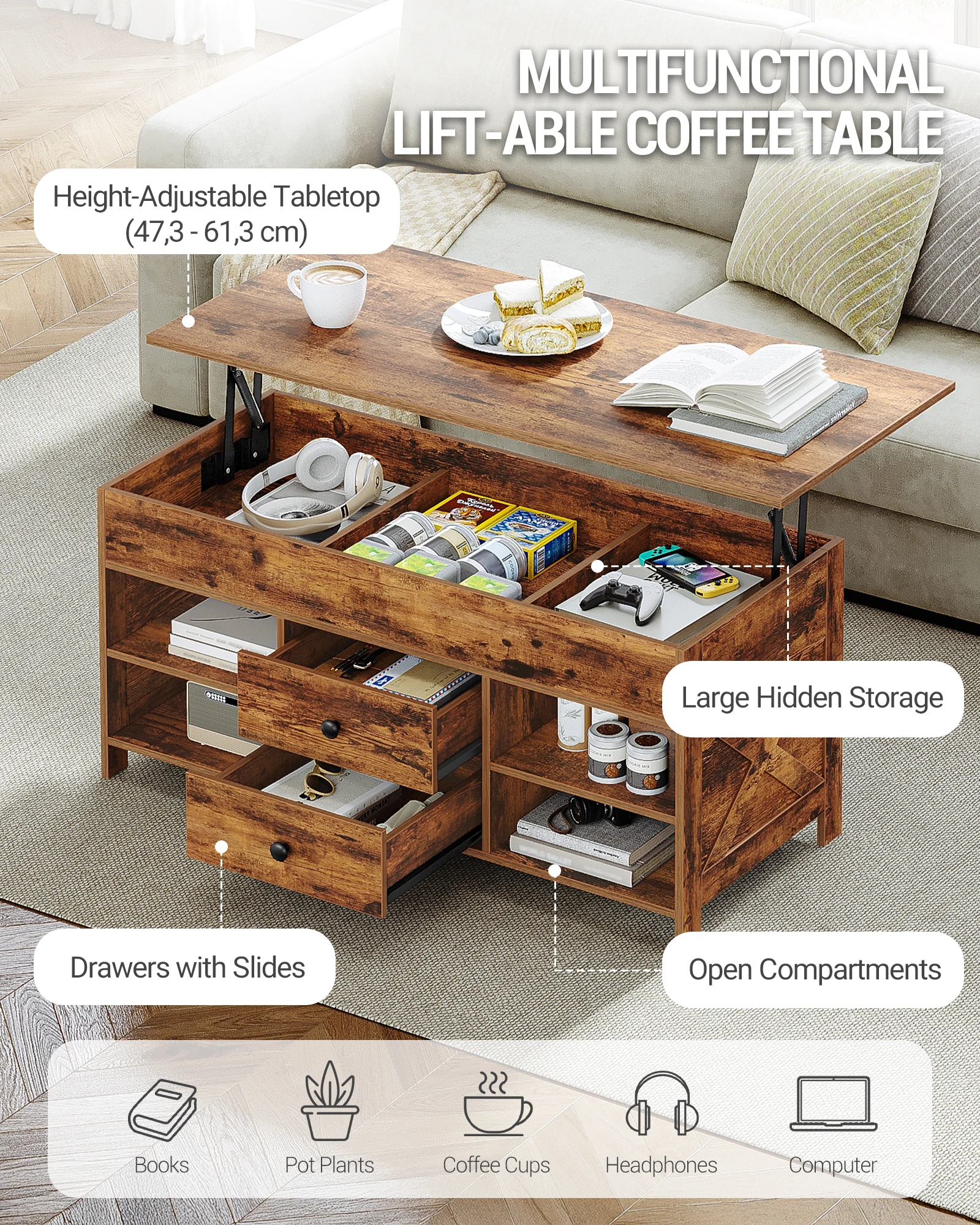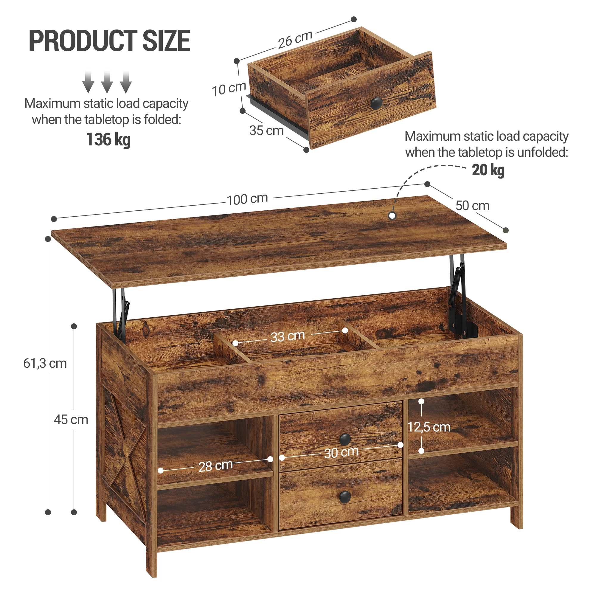 Espace de rangement spacieux : En plus de son plateau spacieux de 100 x 50 cm, cette table de salon dispose de 2 tiroirs, 4 compartiments ouverts et 3 compartiments cachés qui offrent suffisamment d'espace de rangement pour magazines, télécommandes et accessoires de café.La combinaison d'un espace de rangement ouvert et caché vous permet d'afficher vos objets préférés tout en gardant l'encombrement hors de vue, gardant votre salon bien rangé à tout moment