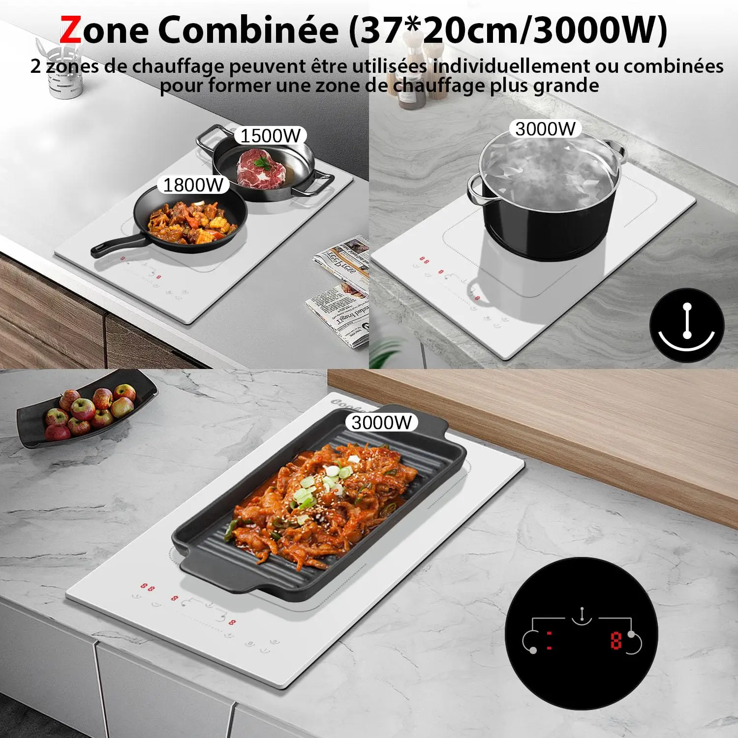 La plaque induction deux feux peut être combinée verser former une zone de cuisson rectangulaire.Les zones de chauffe ont une puissance maximale de 3000W et conviennent aux ragoûts et poêles d'un diamètre supérieur à 16 cm, exemple les grandes plats de fruits de mer or les poêles-grill.