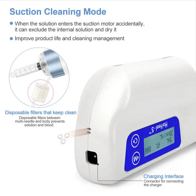 Profondeur d'injection, doses, vitesse et intensité d'aspiration réglables.