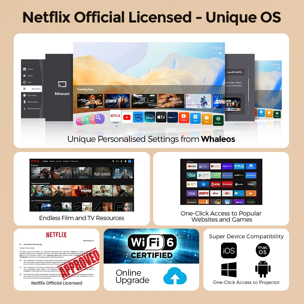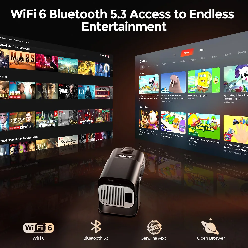 Projector with Apps Built in Netflix-Officially Licensed: iSinbox portable projector stands out for it comes with Officially Certified Streaming Apps. You can access a vast selection of movies, TV shows, and original content from popular streaming services like Prime Video, Netflix, Youtube, and more, all in one place.Don't need to buy additional devices.