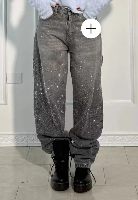 **Design accrocheur** : ces jeans présentent un design unique en son genre avec des strass étincelants dispersés sur le denim, créant un effet de nuit étoilée qui attire instantanément l'attention.