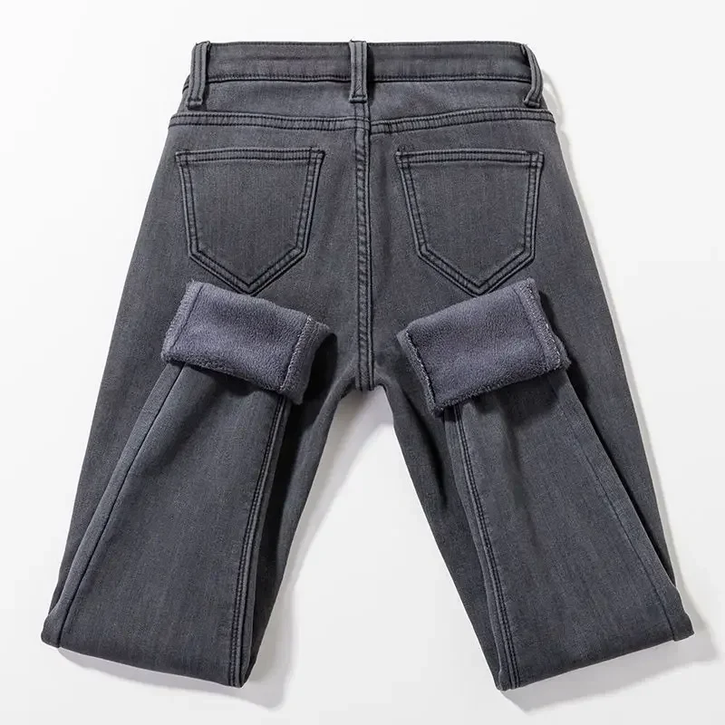Jean rembourré en polaire gris fumé pour femme, pantalon crayon effiloché, taille haute, Style coréen, chaud, épais, élastique, serré, hiver
