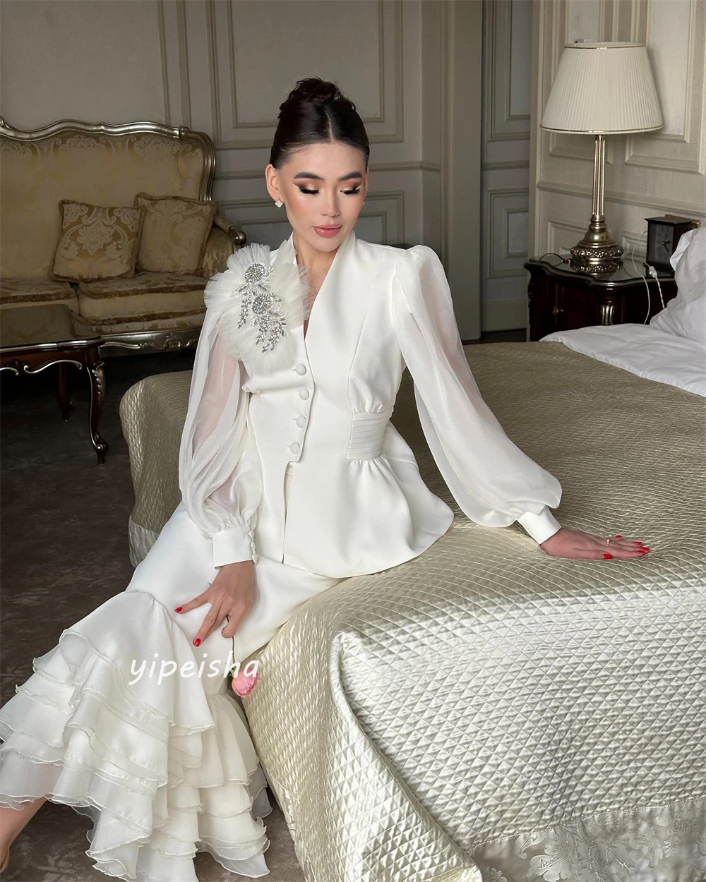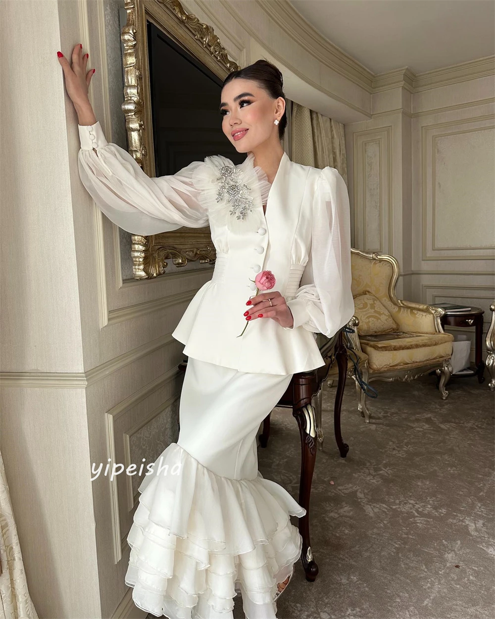 Jiayigong-Robe de Sirène Drapée à Plusieurs Niveaux, Tenue Personnalisée en Jersey, à Col Haut, sur Mesure, pour Occasions, Mi-Longue