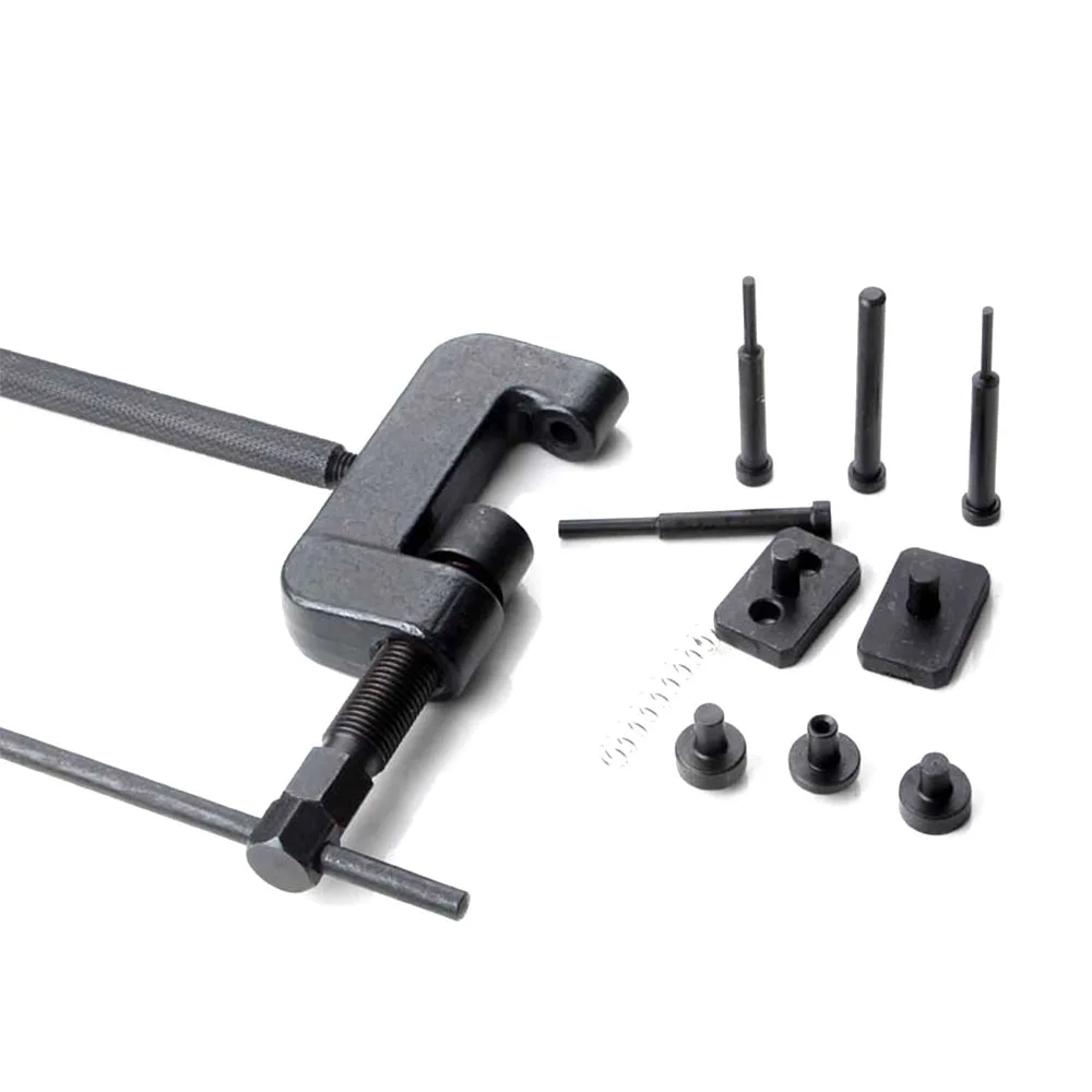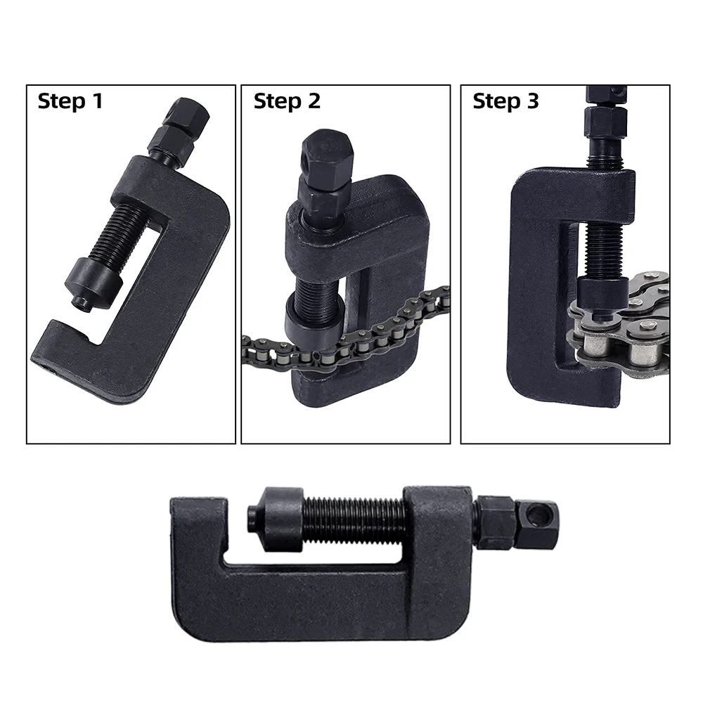 2. Facile à utiliser: Instructions-Desserrez l'écrou du pignon, dévissez le boulon inférieur de l'outil de presse à chane et placez le ressort sur la goupille à l'intérieur de l'outil. Ensuite, remplacez le boulon de jeûne et retirez le boulon supérieur. Vissez la poignée et le levier, placez l'outil sur la chane et serrez l'outil sur la goupille de la chane (cela forcera la chane et la goupille de l'autre côté).